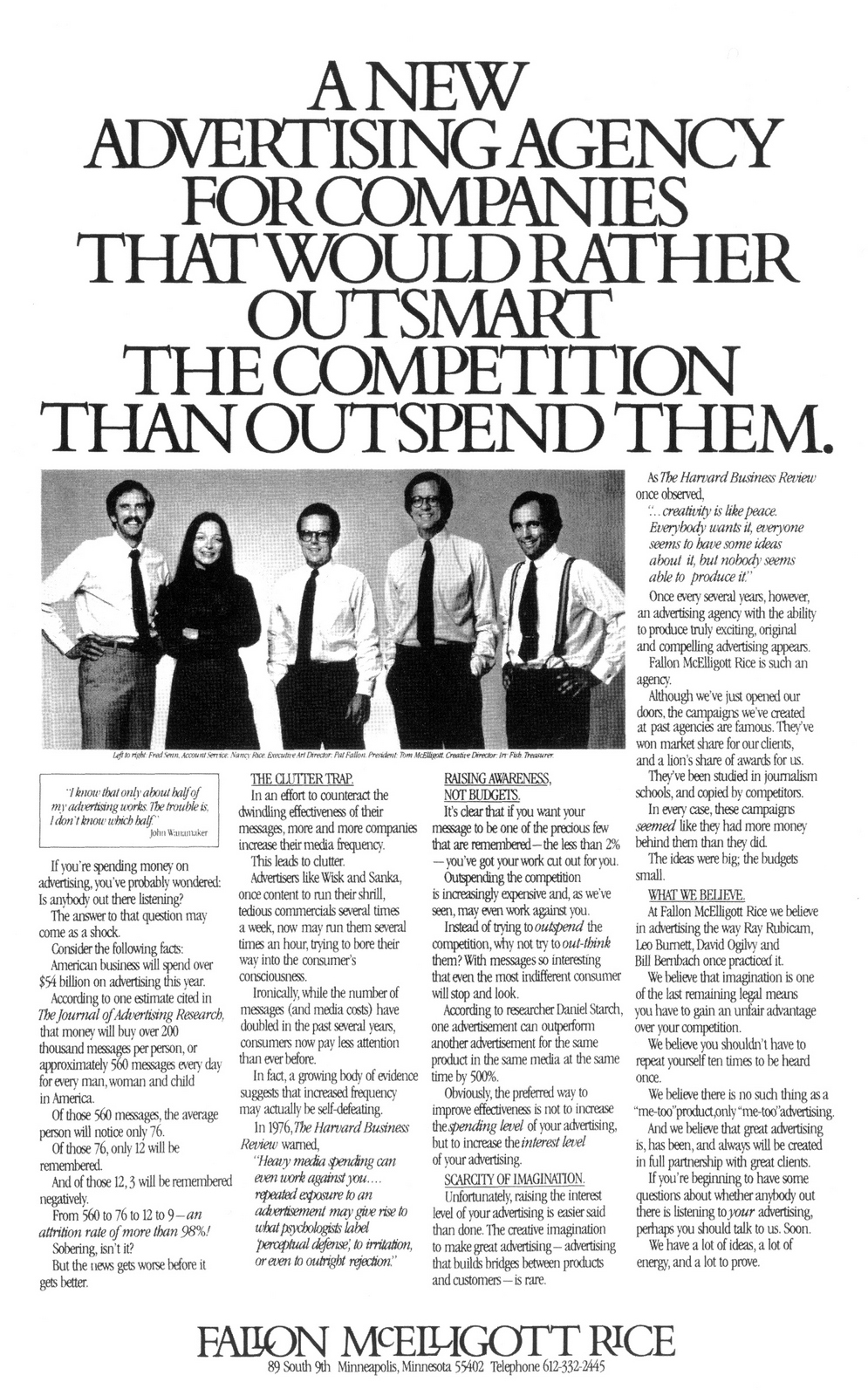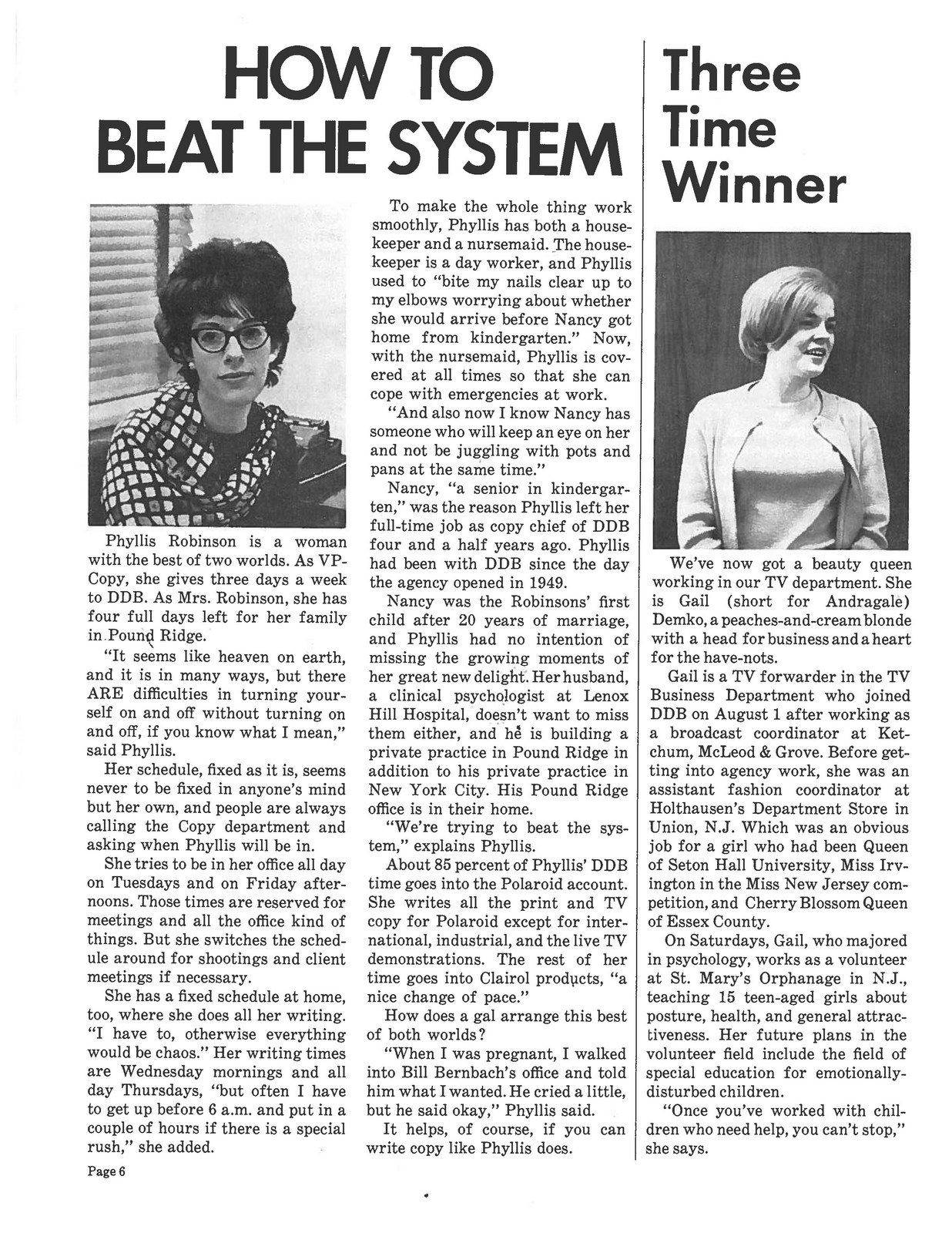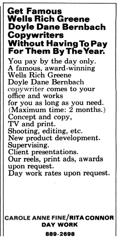 AN INTERVIEW WITH CAROLE ANNE FINE.(Vice President & Copy Supervisor of Wells Rich Green & DDB).Japan's IDEA magazine, 1970.What time do you get to the office and what time do you leave?Between 9:30 and 10 o'clock and I leave my office around 6:30 or a little after. I get home 6:30 or 7 most nights.How do you juggle being a mother and a copywriter?I don't think I even work at it any more.I've worked ever since my kid was born, which was nine years ago.He just knows that I go to work, when I come home in the evening I spend as much time with him as I can. How do you make the two jobs work?One day an incident came up. I had a housekeeper taking care of my child, but when he got sick I had a very important client meeting, so I had decide whether to go or not? As my career had developed, I been given more money, better jobs and more responsibility, so I had to make up my mind which thing do I do?I talked to my husband about it and he said something that was really very good, he's not like a typical male who thinks it would be better if I didn't work at all, I work and he accepts it.He said, "Listen, are you serious about your job or are you not serious about it? John (that's my child) doesn't always come first."Since his temperature wasn't terribly high anyway I knew he wasn't that sick, so I decided to go to the client meeting and let my housekeeper take care of him. If anything bad came up, I could always come home. And I did that. I think it really was the first time when my job became equal to my child and since then, I think, I've become more and more intent on doing my own thing.I'm not answering this in 1,2,3,4... logical steps 'cause I can't. In the very beginning, I'd feel guilty, because when my kid was very little, about three years old, he grabbed me when I came home at night. I was very tired and was still thinking about something that happened in the office, but he grabbed me and wanted me to play a game. I would do it anyway 'cause I felt I ought to.I went through that for about a year but I just got angry with him because I was tired.What I wanted to do was sit down and have a drink, like Scotch, and relax.Then I decided that I had to be straight with him 'cause he was an intelligent child and he would understand. And I just said, "I want to be with you and play with you but I'm not going to be phony about it, 'cause I'll just get mad in the end". Whether he's totally accepted or not I don't know, but he takes things out on me that I think kids with mothers at home may not do.He never has been able to totally get my total attention, I'm aware of it and he's aware of it, but it just worked out. If I were the kind of writer who wrote novels, I'd really love to do a book about the serious career mother, because I think that it's only in this generation, it's only in the last maybe fifteen years, that you have more and more women really dedicated to the job.I am accepted emotionally.I mean, for all practical purposes, I work just like a man.I'm not a man emotionally or in my actions or maybe I do a different kind of work in the sense of where I express myself. But I work just like a man. Are there many mom-copywriters in America?I think yes, but I'm not sure.