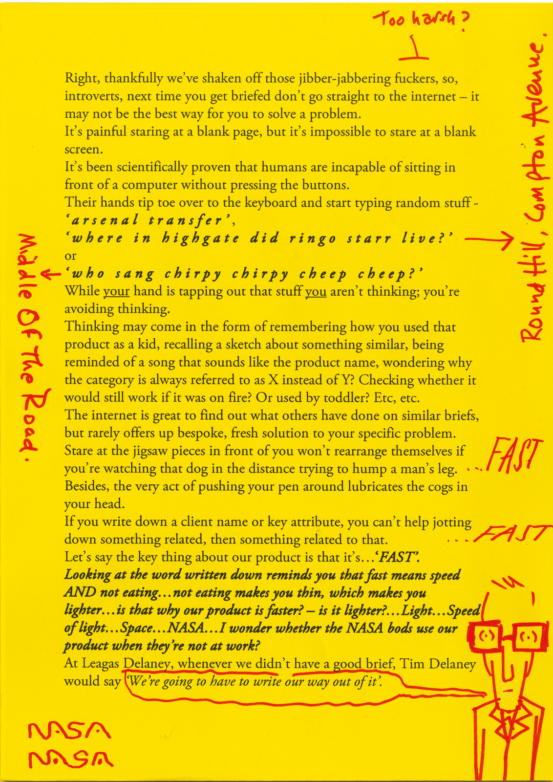 Look at ‘Bill Bernbach’s Book – The advertising that changed the world of advertising’, written by Bob Levenson, a 30 year veteran, both writer and Creative Director. (When Creative Director meant head of all creatives.)