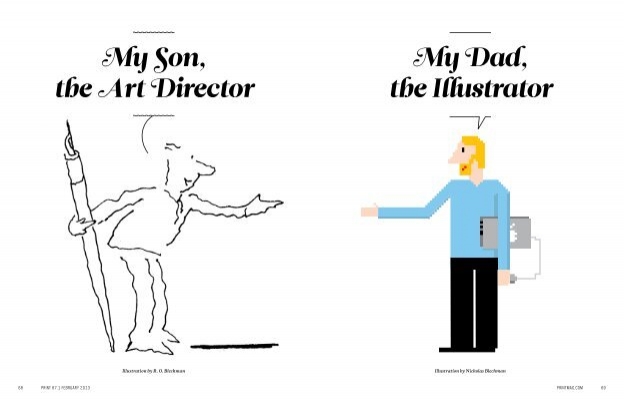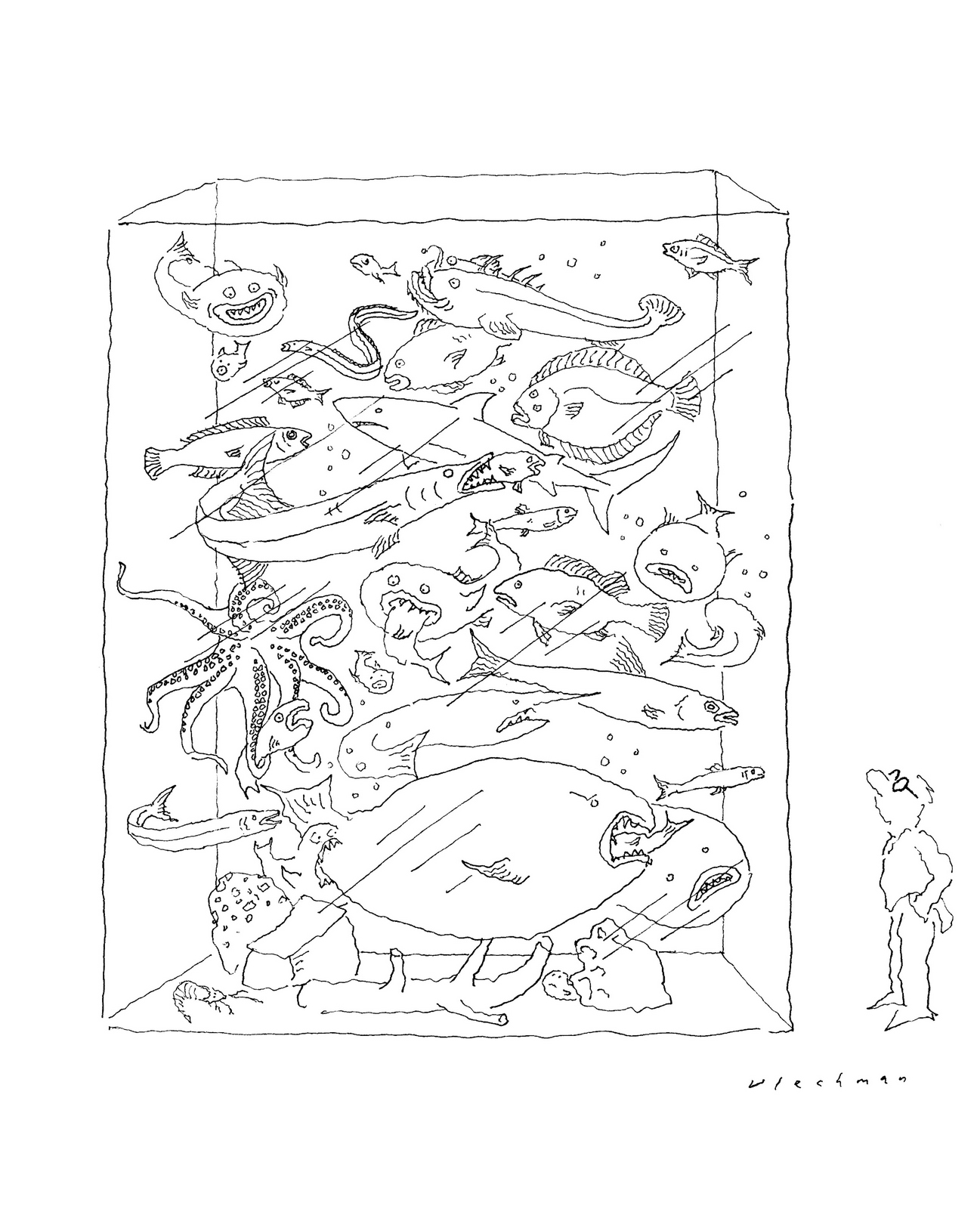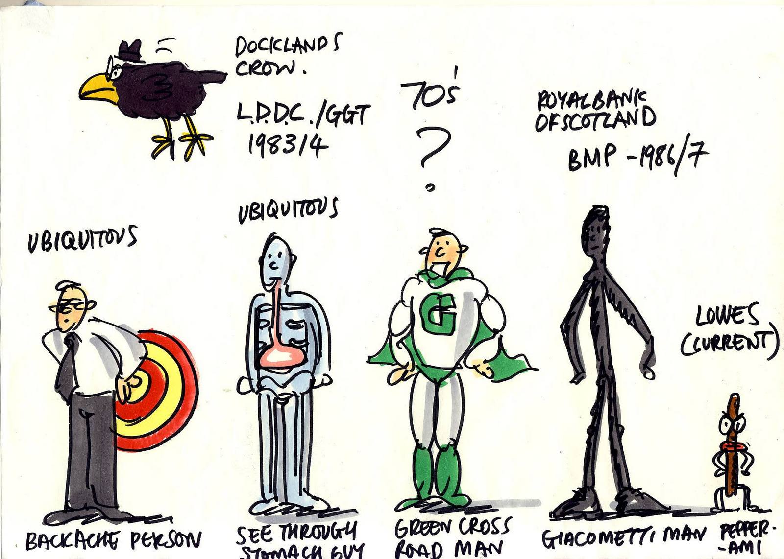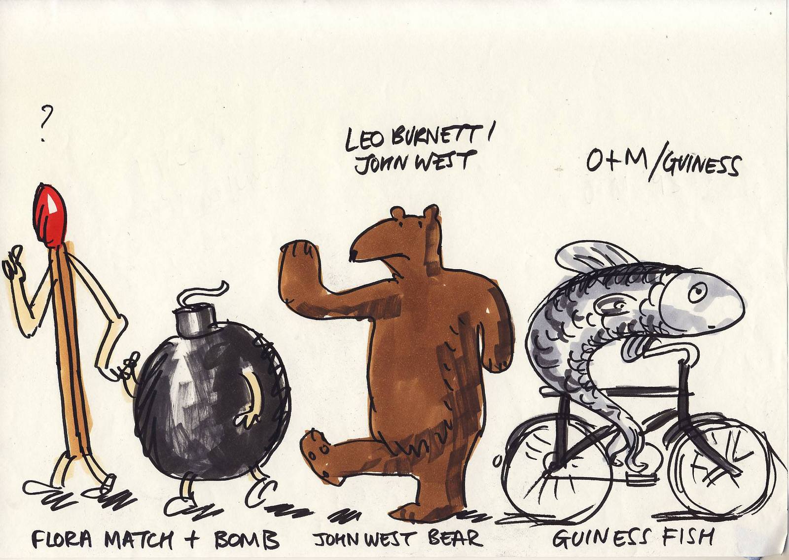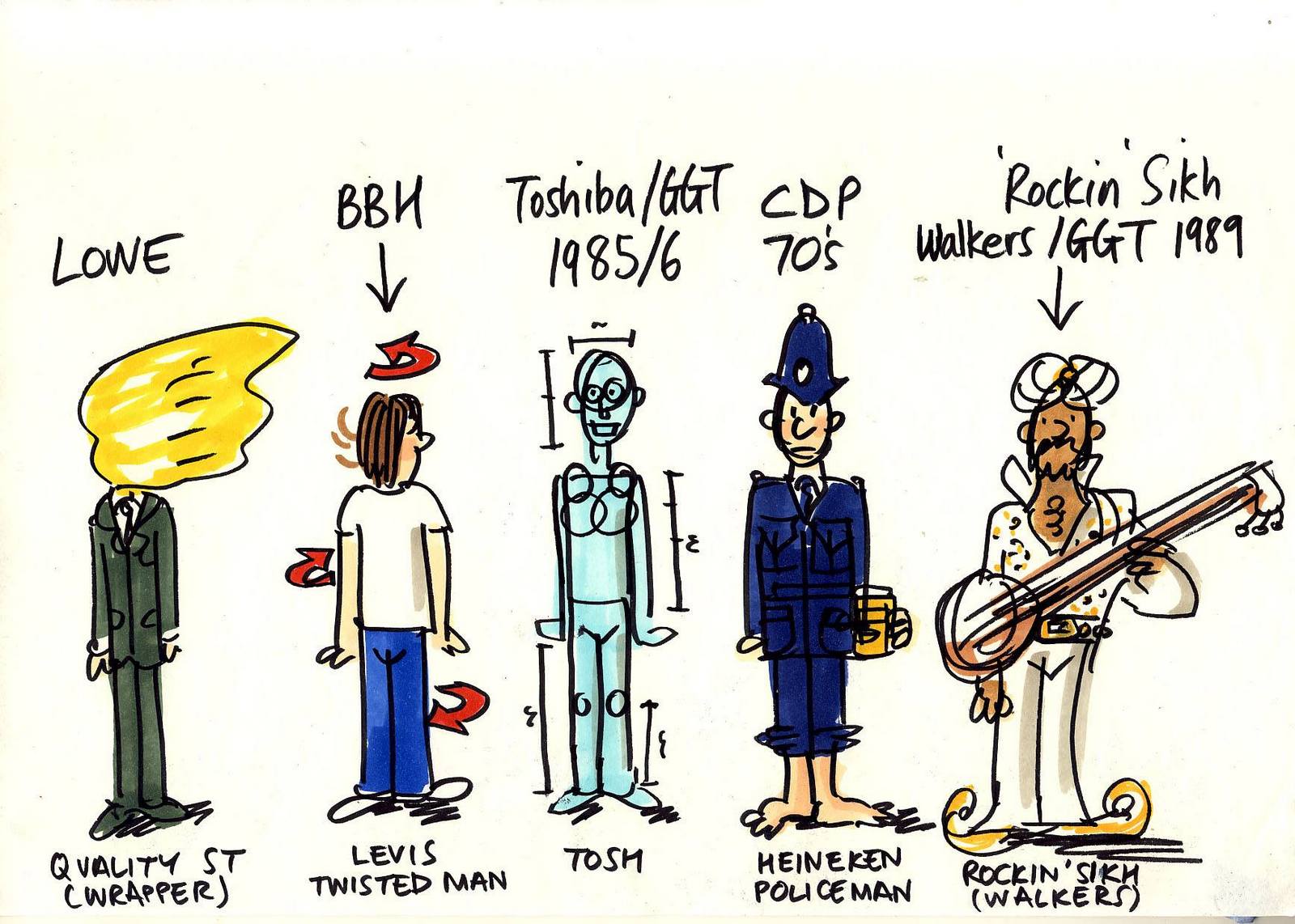 That was the first drawing I saw by R. O. Blechman.I loved it instantly.Firstly, it's a great observation of how companies operate, particularly ad agencies.But also, I was in the ideas business and I'd never seen them represented like that - in different levels from a tiny lightbulb to an enormous chandelier.I also loved the naive style of the drawing.It looked like a note one naughty child would pass to another secretly in class.Drawn in a hurry because they were excited.The apparent lack of craft means it feels personal, human.A master draftsman like Leonardo daVinci couldn't improve it.He'd kill it.Over the years I became more familiar with Blechman's lines.Often referred to as a nervous line.Countless ad folk have copied it - Alan Parker, John Hegarty, Gray Jolliffe and dozens more, including me, it just looks so easy (try it).You'll find you can draw squiggley lines in the shape of a person, but they feel like those chalk outlines the police draw around bodies; dead.Bob's not only feel alive, they conjure up multiple personalities with endless emotions.Often with a couple of dots and two or three lines.It's like some kind of magic trick.And whereas most artists get smoother, slicker and more polished over the years, Bob chose to move in the opposite direction - his line becoming more broken and juddery with each year. (Come to think of it, didn't Picasso take a similar route?)Take a look - early, later, later still.