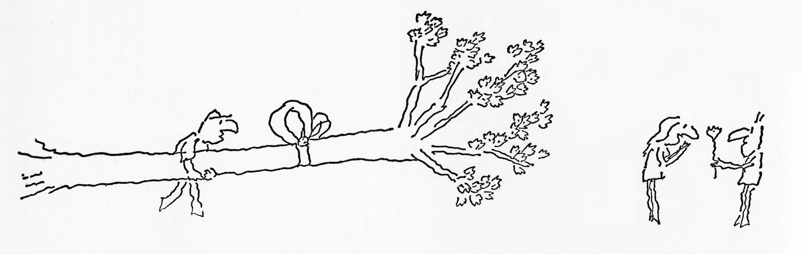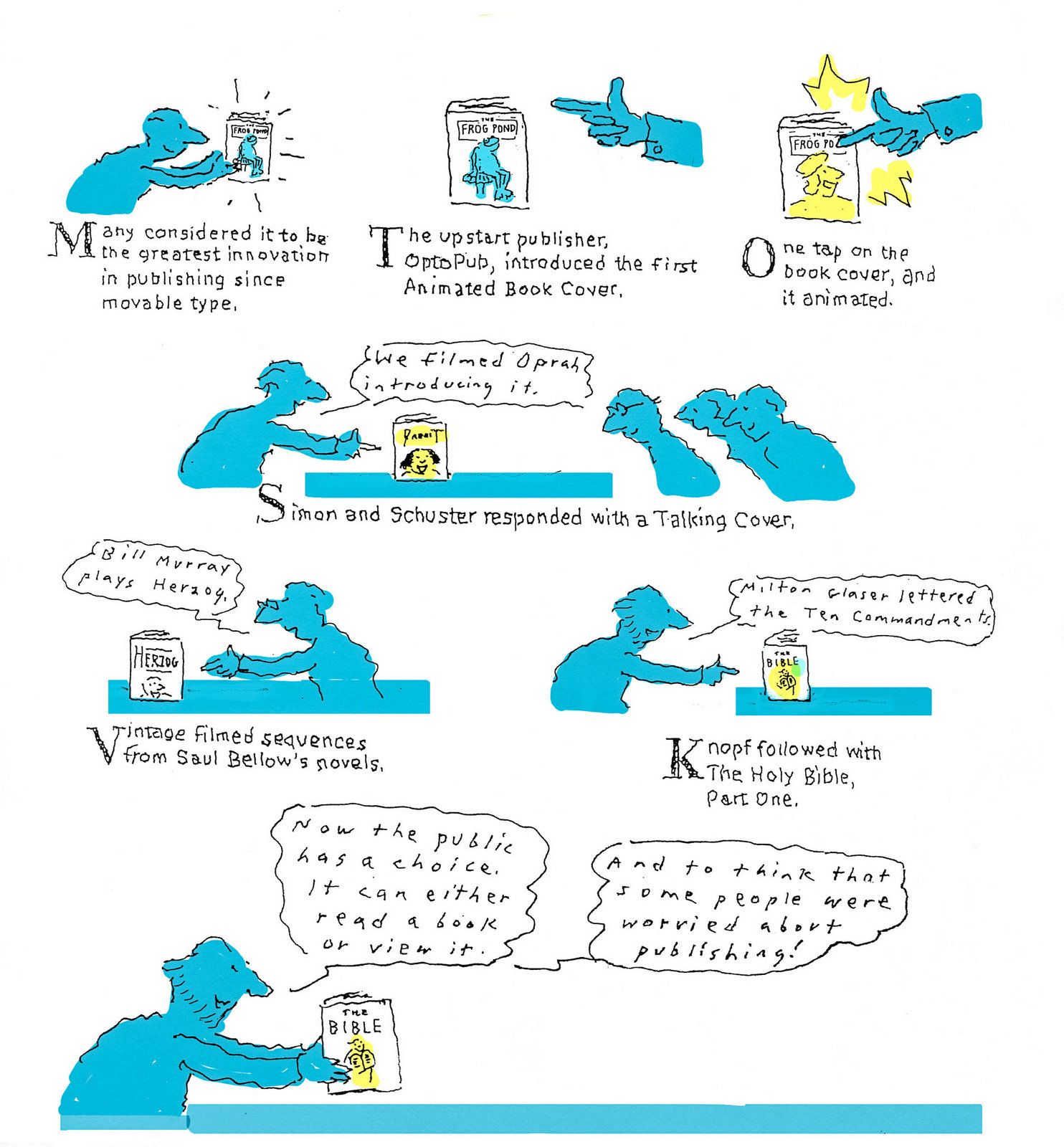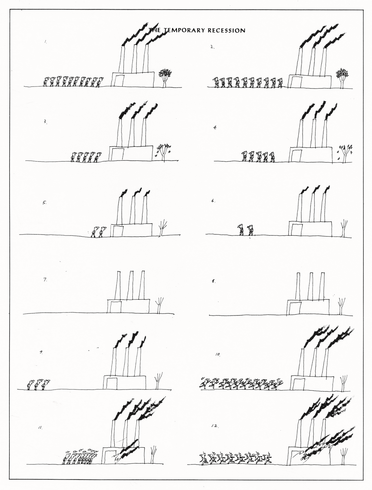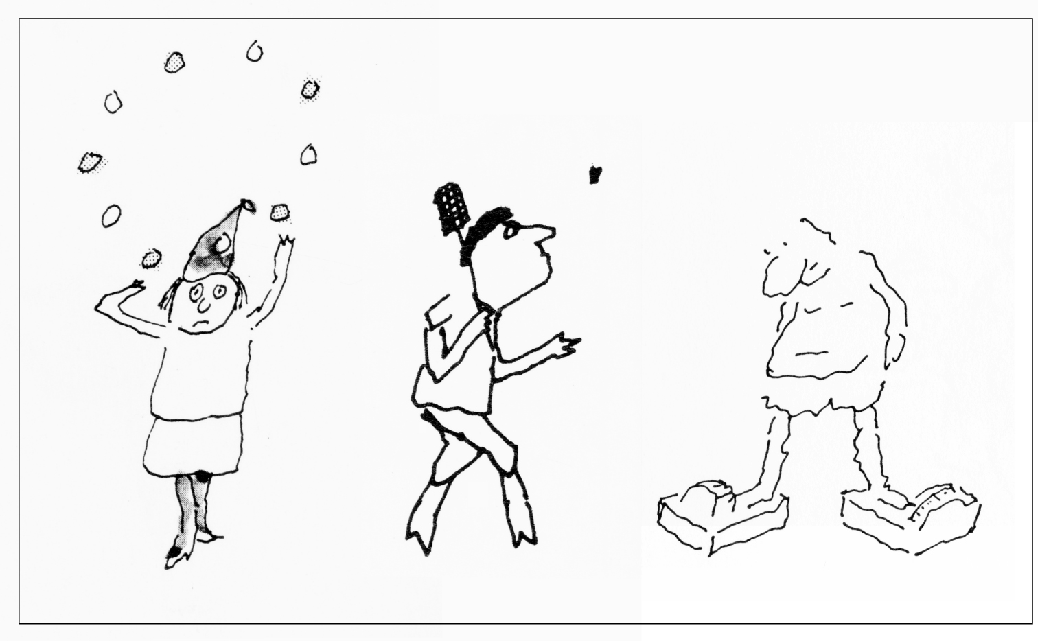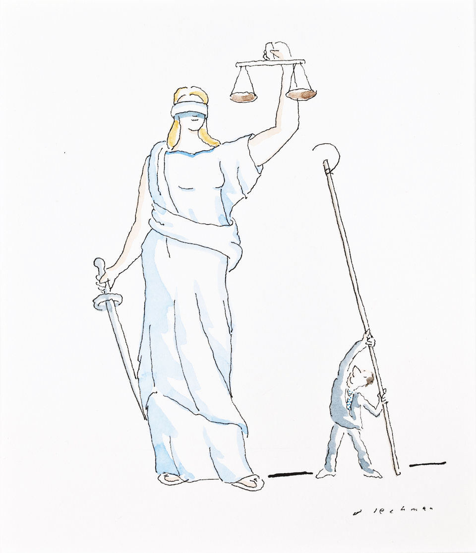 That was the first drawing I saw by R. O. Blechman.I loved it instantly.Firstly, it's a great observation of how companies operate, particularly ad agencies.But also, I was in the ideas business and I'd never seen them represented like that - in different levels from a tiny lightbulb to an enormous chandelier.I also loved the naive style of the drawing.It looked like a note one naughty child would pass to another secretly in class.Drawn in a hurry because they were excited.The apparent lack of craft means it feels personal, human.A master draftsman like Leonardo daVinci couldn't improve it.He'd kill it.Over the years I became more familiar with Blechman's lines.Often referred to as a nervous line.Countless ad folk have copied it - Alan Parker, John Hegarty, Gray Jolliffe and dozens more, including me, it just looks so easy (try it).You'll find you can draw squiggley lines in the shape of a person, but they feel like those chalk outlines the police draw around bodies; dead.Bob's not only feel alive, they conjure up multiple personalities with endless emotions.Often with a couple of dots and two or three lines.It's like some kind of magic trick.And whereas most artists get smoother, slicker and more polished over the years, Bob chose to move in the opposite direction - his line becoming more broken and juddery with each year. (Come to think of it, didn't Picasso take a similar route?)Take a look - early, later, later still.
