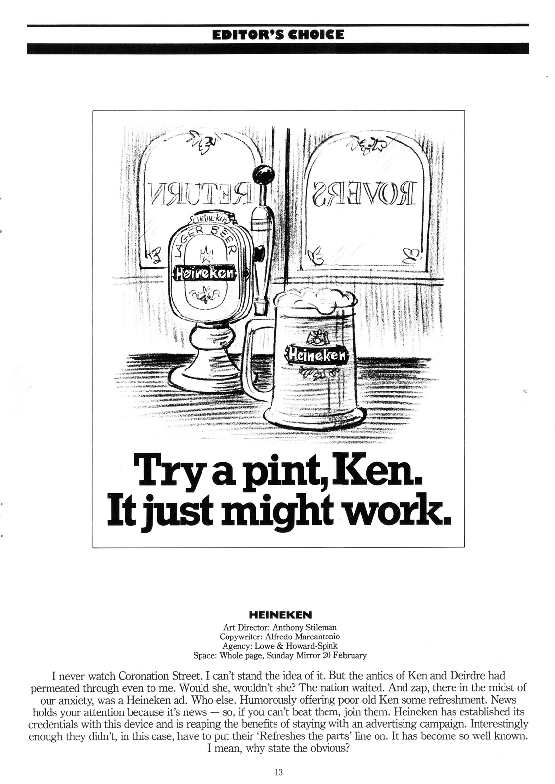 Do you have the desire to have your own agency? Yes, I've been thinking for a while about having an agency in Europe.I know it's very difficult, and if I were strong enough to have it now, I would have it.Most people would.You have to reach your certain level.This is not a pompous statement, it's just a statement of fact; I'm probably one of the highest paid writers in New York. So it gets harder to move agency and make a lot more money, even if you do, you have to give so much back in taxes. When they give me a raise now, even if it's a good raise, I'll get very little left for myself.So the next step is to make real for money, a lot of money.I would like to have my own agency but I'm conflicted, they're treating me very well here.But the only way to really make a lot of money is to have your own place. How would you find business? You have to start with an account.It's that simple.Although I've never really had the discussion with anybody who did it, but I think if you have just one account, maybe if you're working at an agency with a client who's unhappy with the agency but happy with the writer and the art director, maybe you go and talk to them?You get one client interested in you and then you can start an agency.If you're going to bill $2.5 or $3 million a year, that's enough to start an agency.It's kind of like doctors; it's all about reputation, do something good and that's how it starts.More Carole...Carole went on to found her own agency - Baron, Costello & Fine.(Work below.)