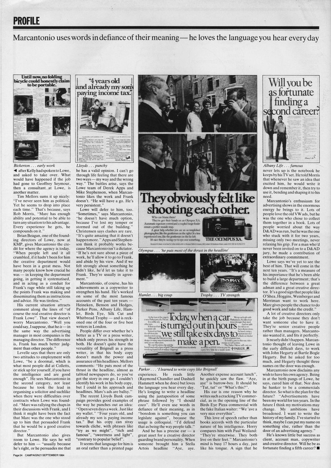 Of your own work, what do you like best?Usually, when I finish something, I don’t like it. It’s a very common reaction.I always think “Why did I do it that way? Maybe I should have done it this way."A lot writers think this way.I always think I could've done it better. Now, one of the ads that I like best is a commercial for Love, which I've just done, it's running on television now.It's a whole new kind of concept that hasn't been done before.The problem that Love cosmetics had was that they were appealing to very young kids; teenagers between 14 and 20, but they couldn't make enough money that way. So they wanted to change the whole thing.They needed to appeal to between 25 and 30, take a slice out of the bigger cosmetics market, out Revlon, Revlon.Giving a very clear idea of what the product is, that's a hard sell.I think cosmetics should be sold on sex, I think that's really the feeling of the age, I mean that's like what it is today.The simplest way I can describe Love is based on sex.It's a kind of sexy commercial that's never be done before, without being dumb sex or boring sex.I'd need to show it to you right now to describe that feeling.It's the people that we picked to be in it, the kind of the situation that we picked. It’s really is one of my favorites.The other one was a campaign I did about a year and a half ago for Buitoni.It was very bold, very crazy, we took a very ordinary selling point and turned it into something very fresh.I really had a lot of fun with it and it just hit the Americans with a kind of boldness and that worked.