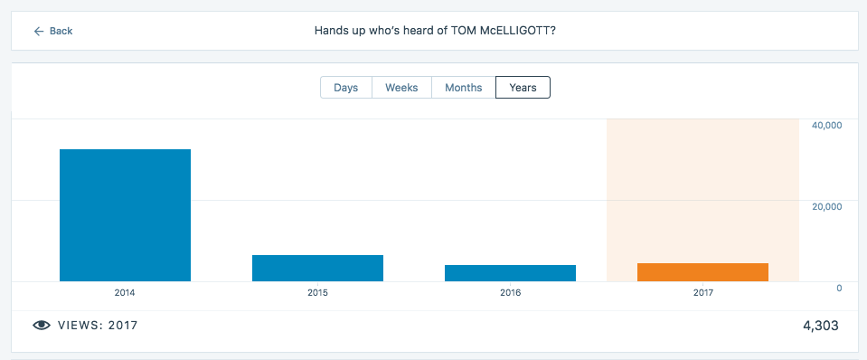 The first one got about 38,000 views when it was posted in 2014, the majority in the first month.The second has got roughly 2,800 views to this point, 9 months into 2017. (Weirdly, the first one has been viewed more in the last six months than the podcast; 4,300 views.)Why are the first numbers are so high and the second's numbers so low?I get to the same place as I do with the maps; I'm interested in the numbers but not driven by them, I'm driven by curiosity, I got to ask Tom McElligott every question I could think of for nearly three hours.5. HUMOUR DOESN’T ALWAYS TRAVEL WELL. I don't know whether it's a British thing, an irony thing or a me thing, but often the intent doesn't transfer.Eg 1: I asked DDB legend Len Sirowitz was ‘who's your favourite Len; Bruce, Bernstien or Fairclough?’ ‘I'll ignore that’ he said.Eg 2: I found a picture of Gerry Graf standing next to a very old guy and couldn’t resist putting the pink spot on the guy next to Gerry.