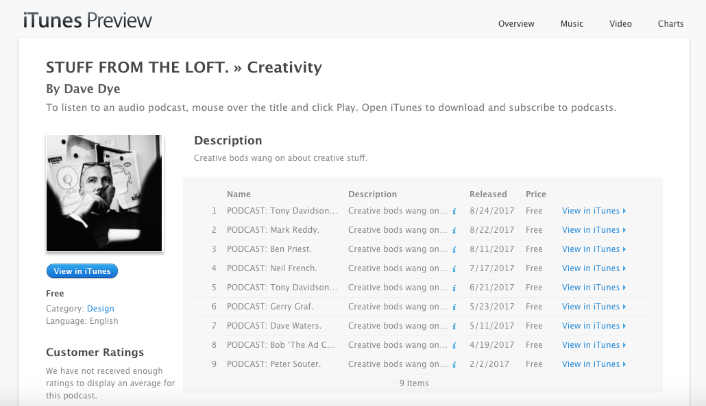 I couldn't help title the post 'David Troff Interview'. A lot of people shared the post on Twitter, attached were messages like 'Check out some cool work by British Creative David Troff'.6. NEVER PUT OUT A PODCAST OUT WITHOUT EDITING. It sounded like such a good idea. a) You put out a real, warts 'n' all genuine conversation. b) You don't have to listen to yourself wang on for three hours and worry about how you sound. c) You save time. Three minutes of dead air in the Peter Souter episode changed my views. (We went for a pee.) There's another benefit to editing, it's allowed me to capture and weed various slips of the tongue; someone slagging off their current boss, another criticising their friend, one even said 'advertising isn't as good as it used to be', nobody wants to go on the record saying that out loud, so he asked for that to be taken out. (After a while spent wrestling with RSS feeds, the podcasts are finally up on iTunes: https://itunes.apple.com/us/podcast/stuff-from-the-loft-creativity/id1265125334?mt=2)