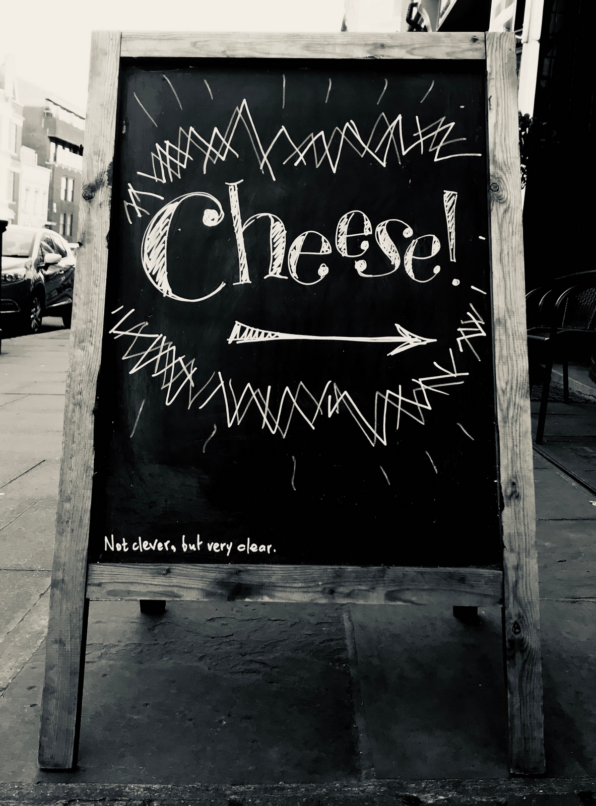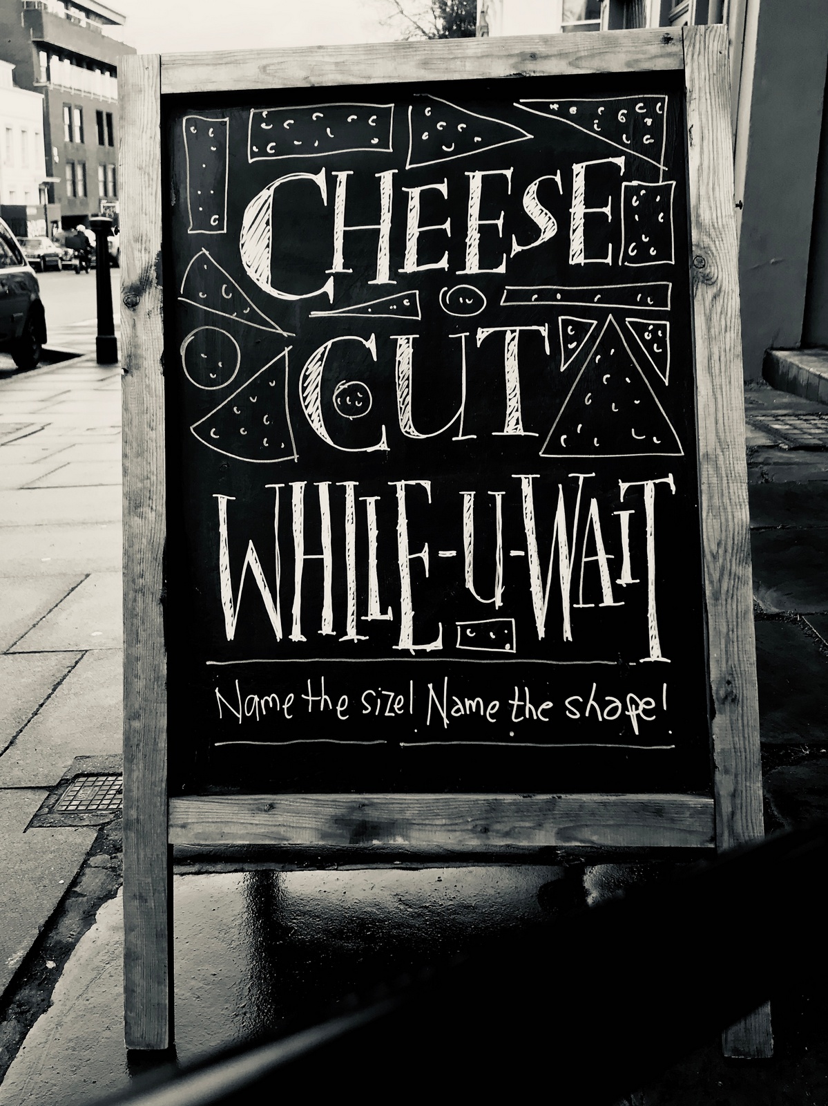CLIENT FEEDBACK: "Mixed, I had a lot of people saying they thought that board was funny...and probably the same amount ordering cruffins...which I don't sell."Wow! Humans; what a bunch of nutters! It literally says 'we don't sell cruffins' in big words.It's the kind of feedback you get when being debriefed by research companies and don't believe.CHEESE.Generic cheese; what do we say?I like the idea that cheese you buy from a deli comes in exactly the size you want, not a predetermined block.Bespoke sizes?We cut just the amount you need?I know we're not solving a problem people have with cheese, but it reminds them its fresh cut, not pre-packaged supermarket cheese.