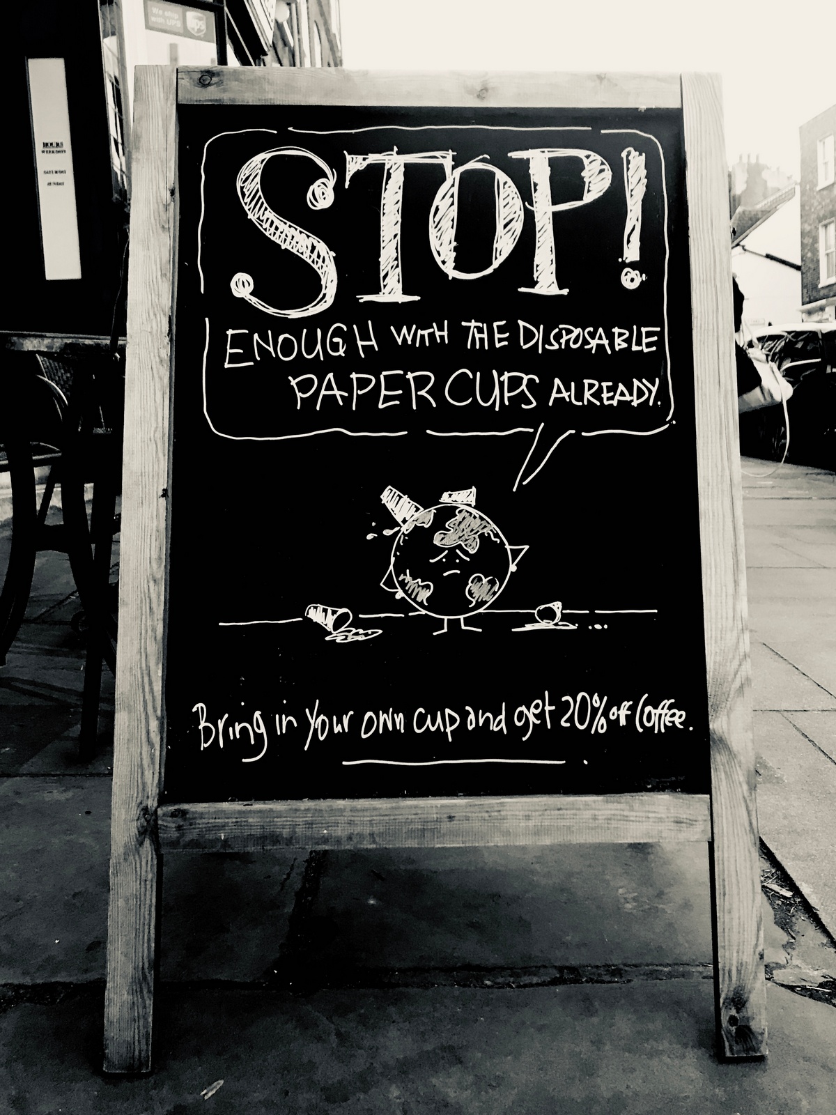 CLIENT FEEDBACK:"Not bad, bit of an improvement in sales, sold a few plastic cups too.One bloke came in to ask who did the signs as 'all cups are portable, I know about these things...I'm an author' ".Not sure about the portable thing, it was supposed to be a joke?But the thought isn't motivating enough?WEEK 6.COFFEE CUP ISSUE.A new push to sell coffee without the paper cup.So, 20% off.Initially I come up with an idea for a cup of coffee loose, wobbling around like liquid in space, with a line like '20% OFF COFFEE, YOU'LL NEED YOUR OWN CUP THOUGH!'But then I think; 20% didn't move people last time, why should it this time? The cute wobbly coffee visual? I don't think so.Taking your own cup to and from the store is a pain in the arse, the only reason people do it is to do their bit for their planet; we need either:a) Picture of their planet.b) The word 'SAVE!'orc) The word 'HELP!'.Initially I write 'Save this and 20% off this' next to a picture of Earth and a cup of coffee.Bit serious.