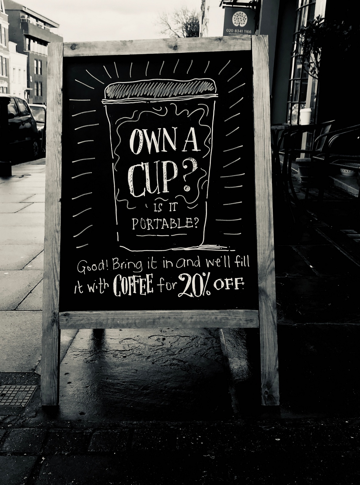 CLIENT FEEDBACK: "Cheese sales continued to be strong."Blimey, I wonder what difference the executions are making? Is simply calling out cheese enough? Would sales be just as strong if just wrote 'Cheese' with an arrow next to it?COFFEE CUP ISSUE.Just up the road is a Fancy Dan branch of the Gails chain, they've just introduced a new, ecologically sound coffee cup which seems to have hit Limone's coffee sales.The client has suggested giving 20% off to people with their own cups, that's even more ecologically sound than Gails offer.I sketch out a big call to action idea.