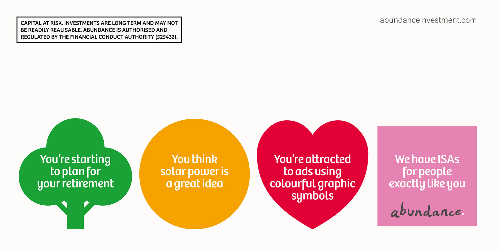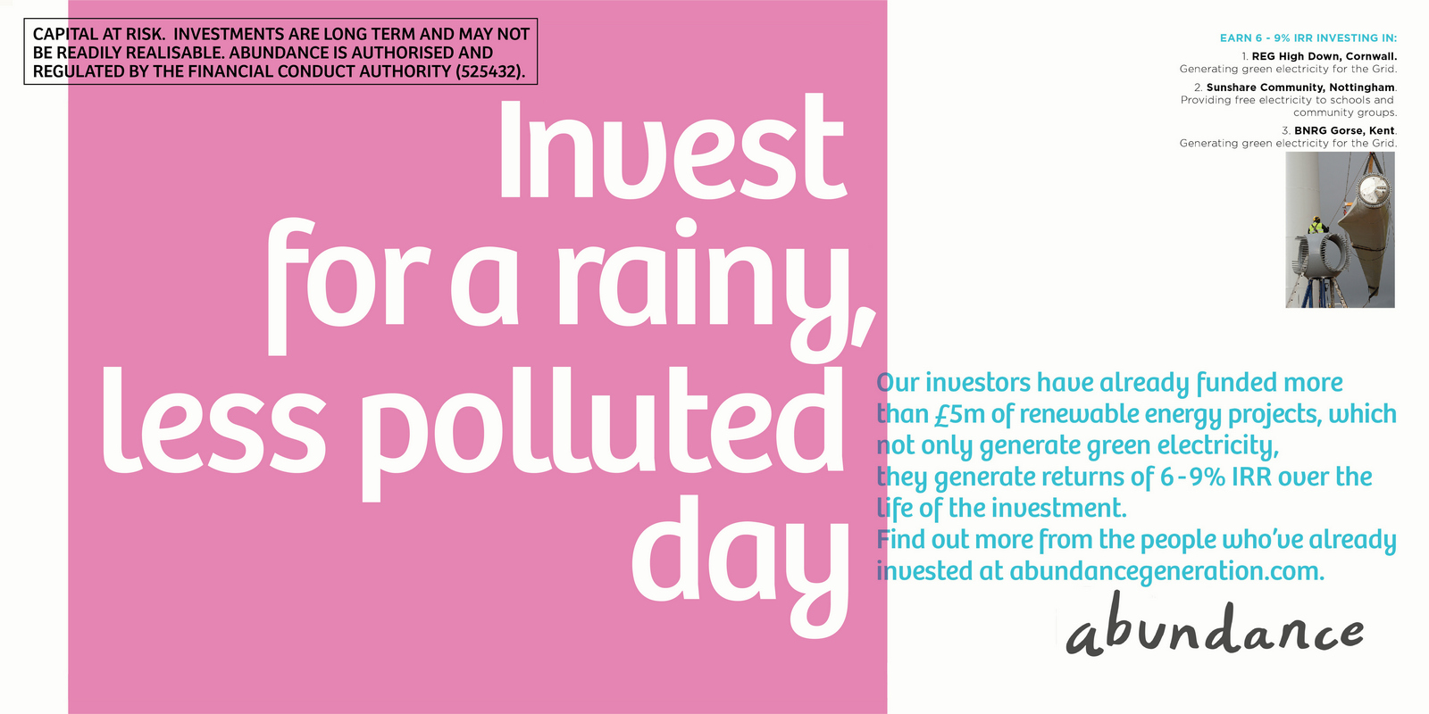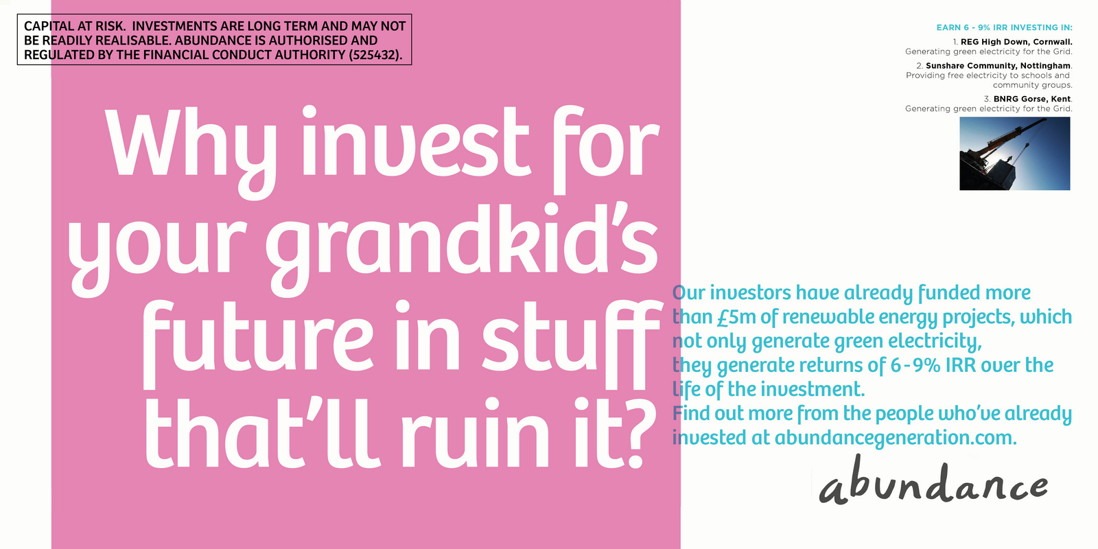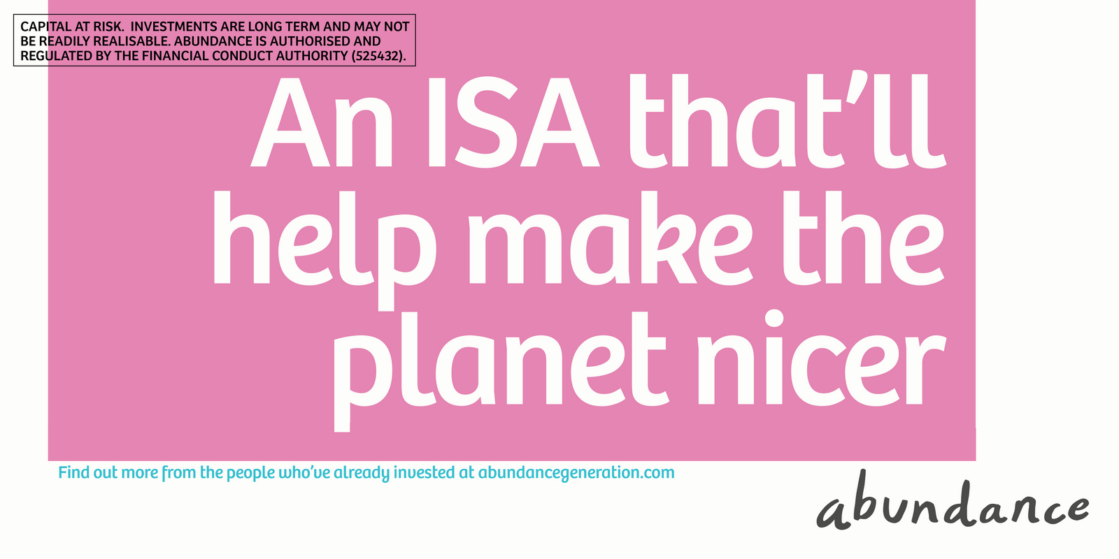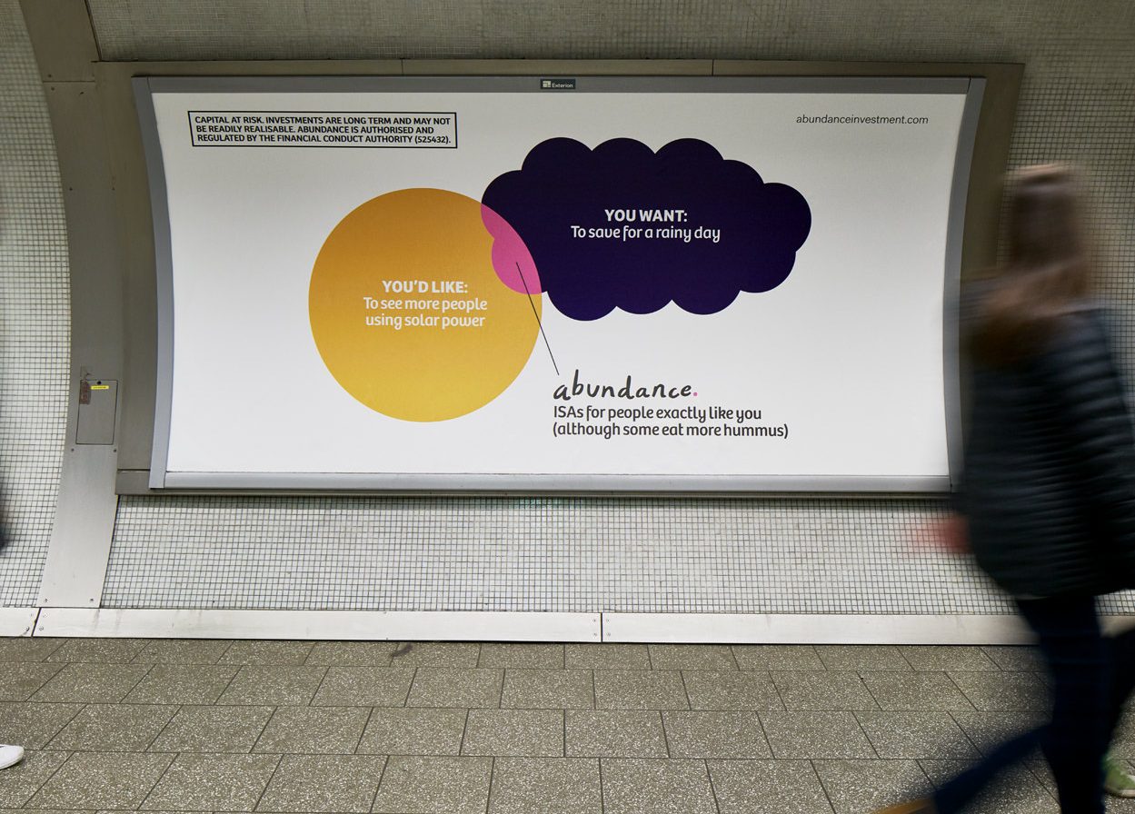 Not necessarily a bad decision.A shame though, as I liked the idea of owning a colour and changing and expanding out its graphic use with each new campaign.But a seed was planted.A decade later I got a brief for a new company that was investing in green projects; Abundance Investments.They didn’t have a big production budget, Nadav Kander pictures were out, graphics were in.If we are going to go graphic they needed to own a colour.But what?Most are taken and they aren’t making new ones.It would have to represent Abundances vibe – which is green, positive, utilitarian and non-corporate.First, anyone with green leanings use green.Seemed a bit obvious.Most financial institutions are blue, often dark.Orange felt positive but it was owned by Orange, the phone network.In the end pink was chosen.