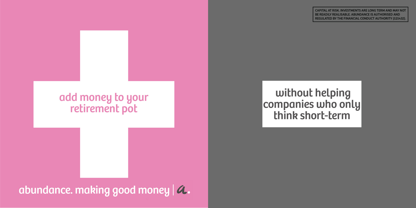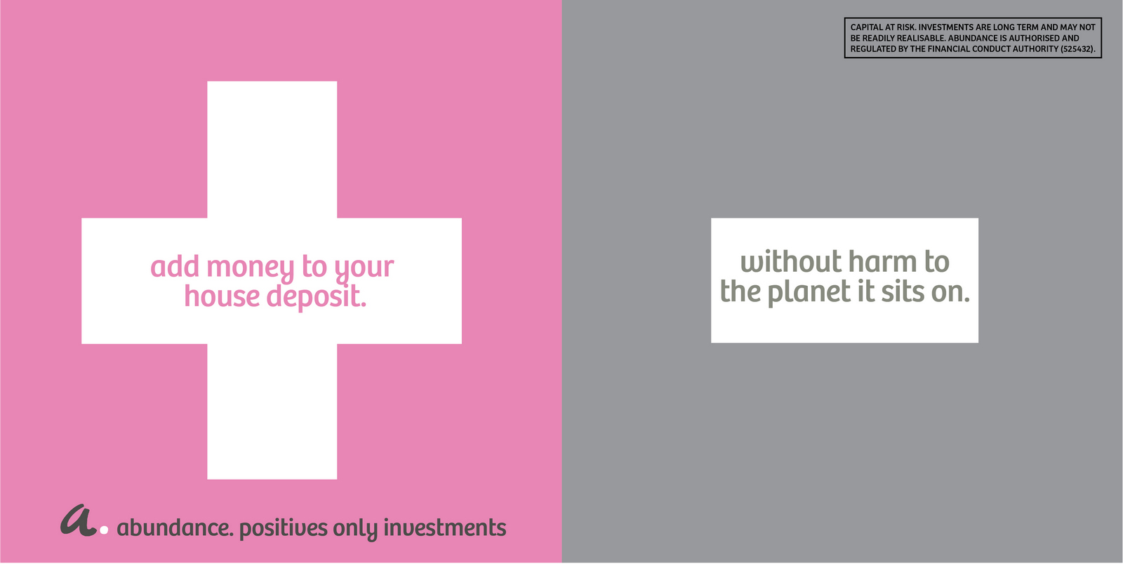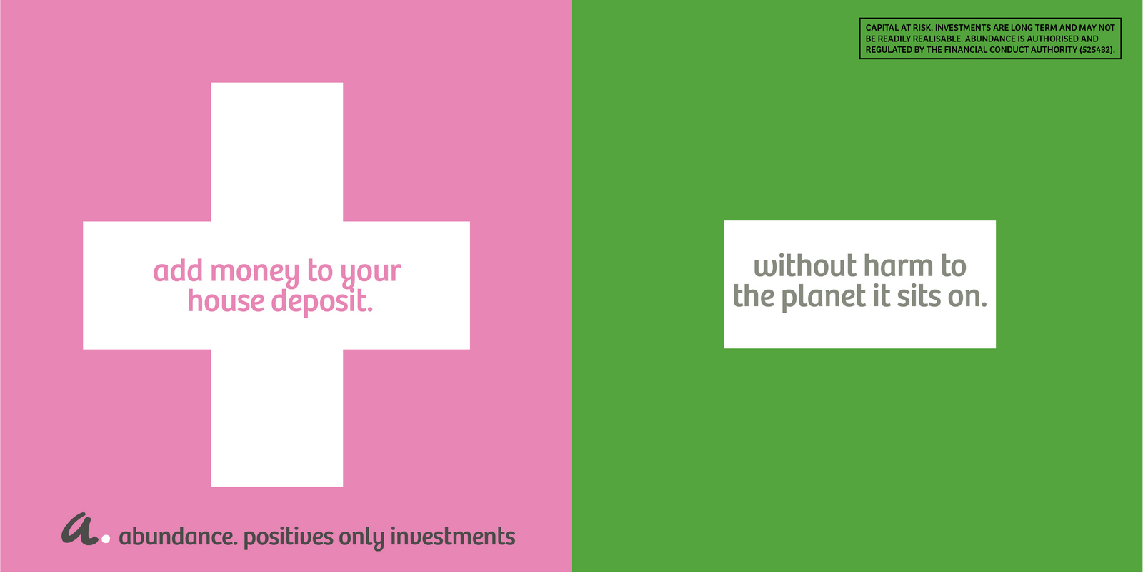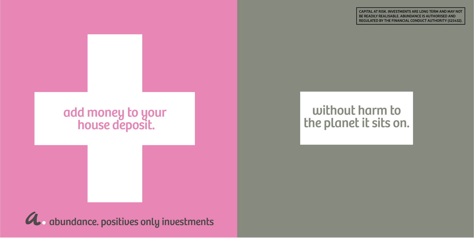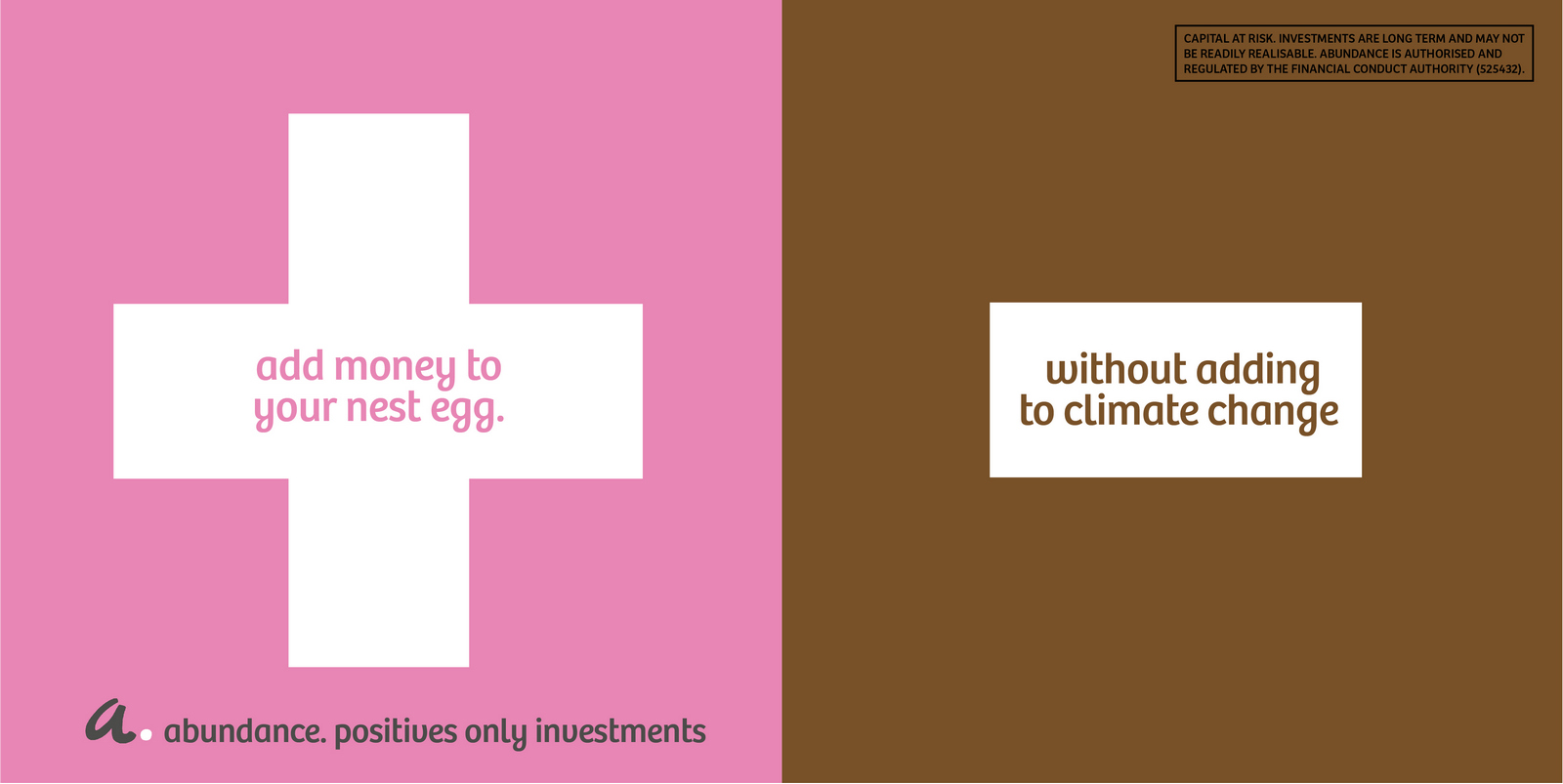 Not necessarily a bad decision.A shame though, as I liked the idea of owning a colour and changing and expanding out its graphic use with each new campaign.But a seed was planted.A decade later I got a brief for a new company that was investing in green projects; Abundance Investments.They didn’t have a big production budget, Nadav Kander pictures were out, graphics were in.If we are going to go graphic they needed to own a colour.But what?Most are taken and they aren’t making new ones.It would have to represent Abundances vibe – which is green, positive, utilitarian and non-corporate.First, anyone with green leanings use green.Seemed a bit obvious.Most financial institutions are blue, often dark.Orange felt positive but it was owned by Orange, the phone network.In the end pink was chosen.