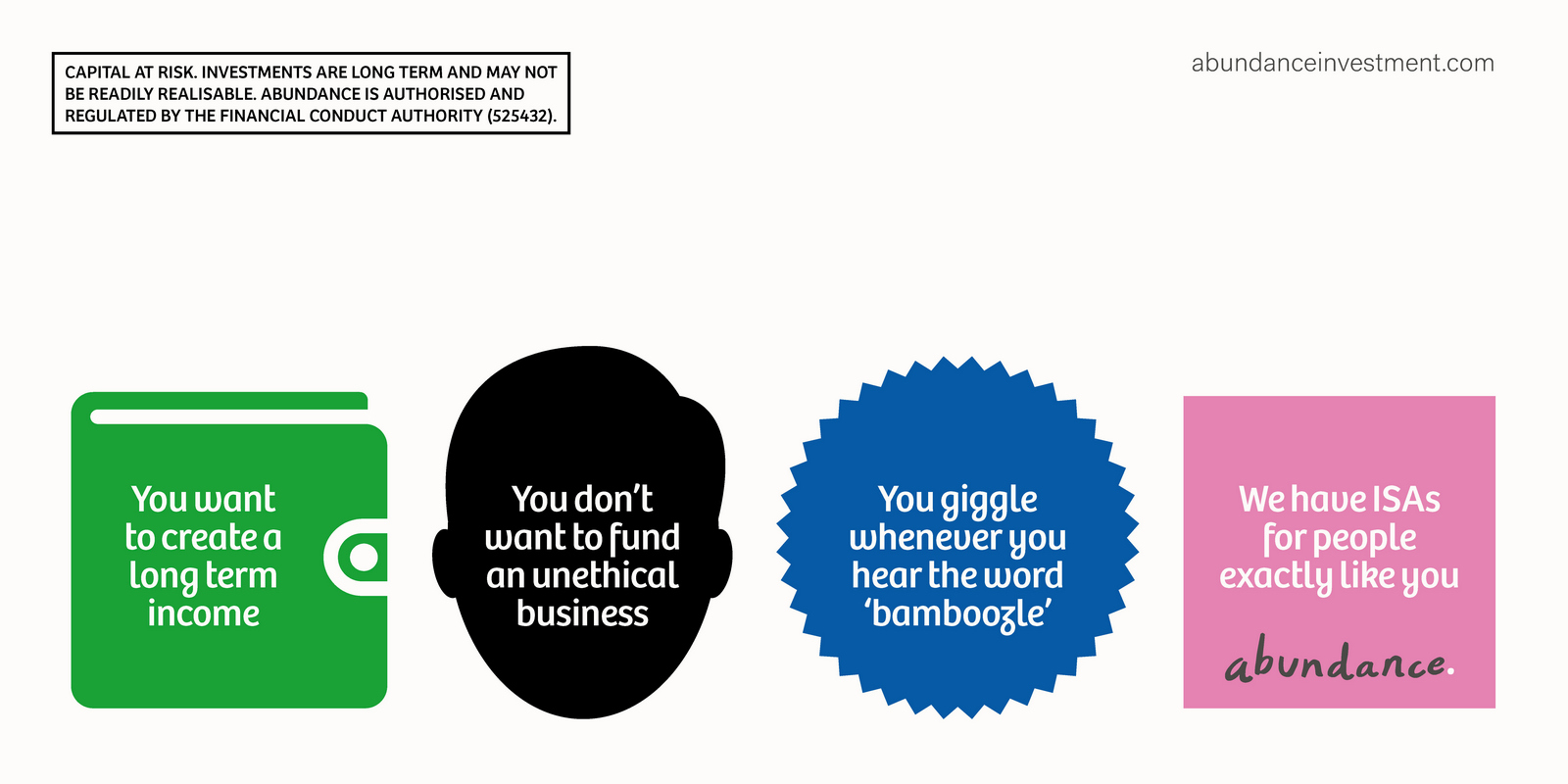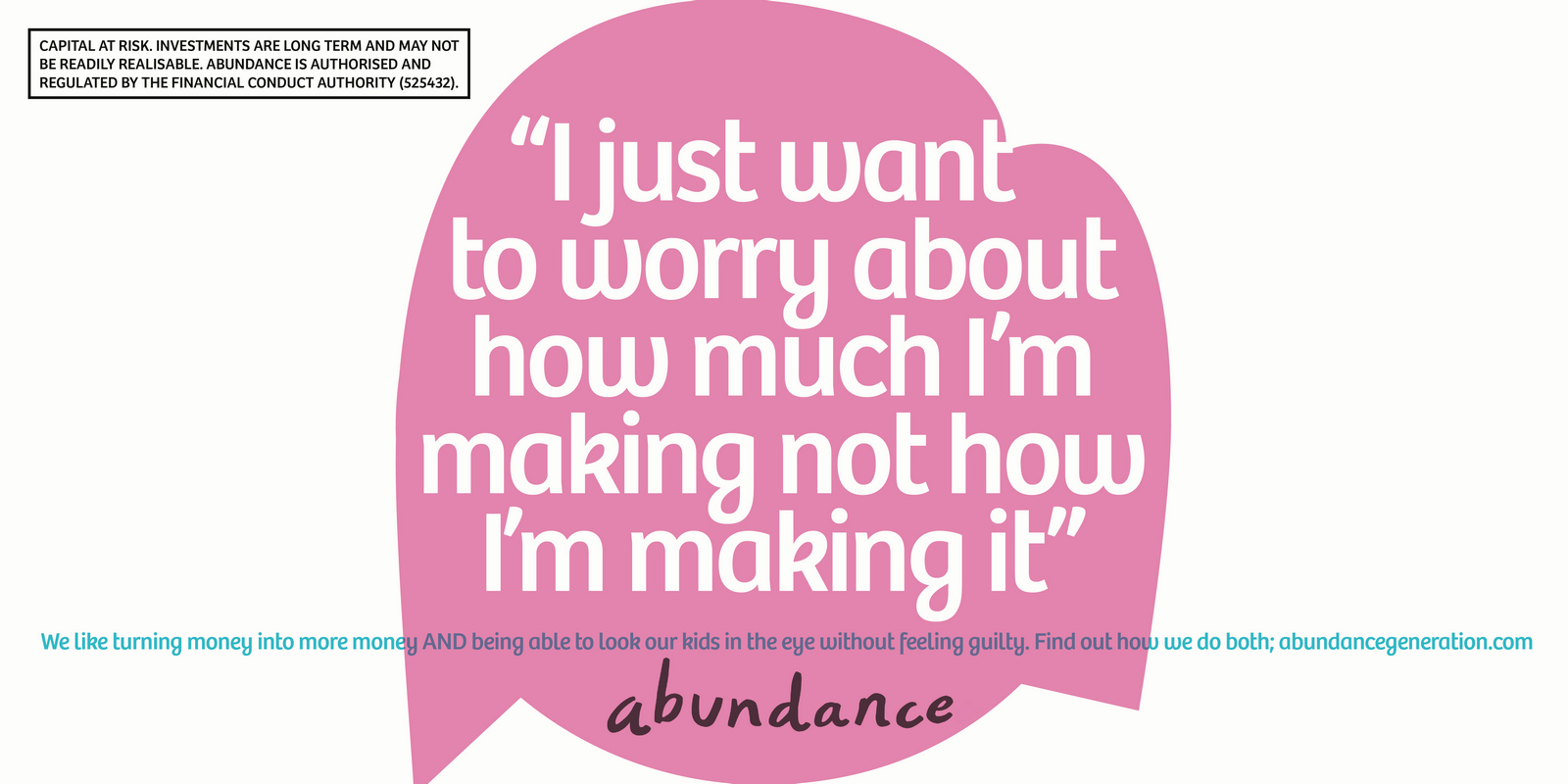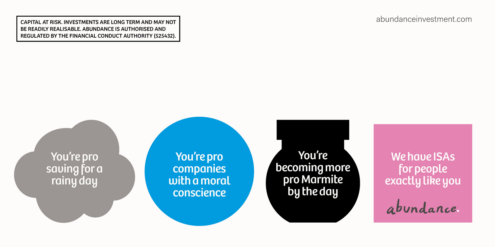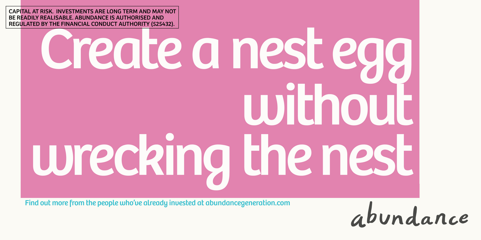 Not necessarily a bad decision.A shame though, as I liked the idea of owning a colour and changing and expanding out its graphic use with each new campaign.But a seed was planted.A decade later I got a brief for a new company that was investing in green projects; Abundance Investments.They didn’t have a big production budget, Nadav Kander pictures were out, graphics were in.If we are going to go graphic they needed to own a colour.But what?Most are taken and they aren’t making new ones.It would have to represent Abundances vibe – which is green, positive, utilitarian and non-corporate.First, anyone with green leanings use green.Seemed a bit obvious.Most financial institutions are blue, often dark.Orange felt positive but it was owned by Orange, the phone network.In the end pink was chosen.