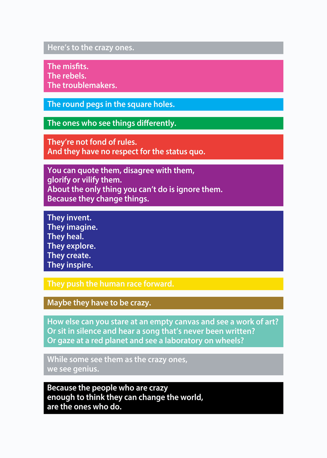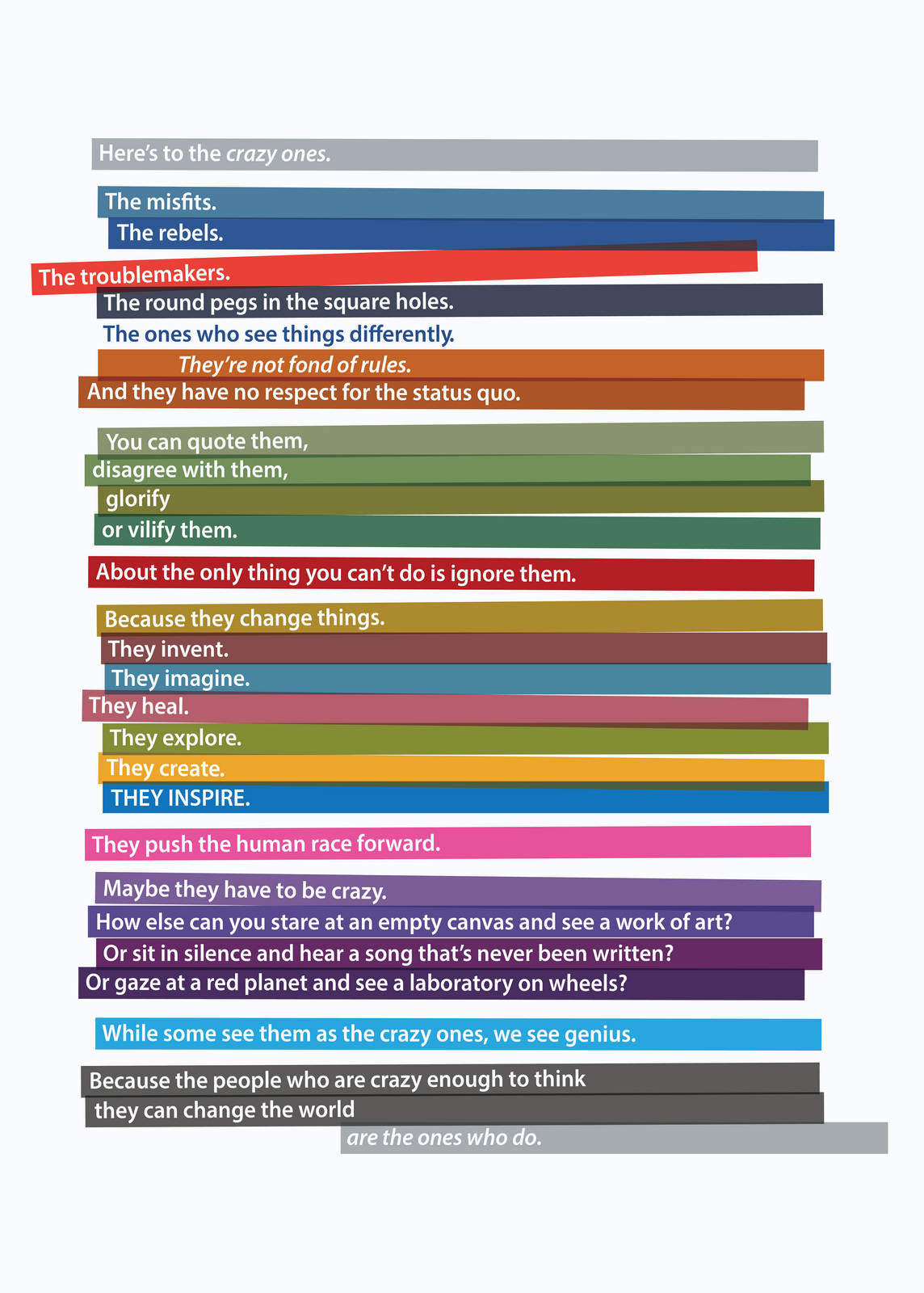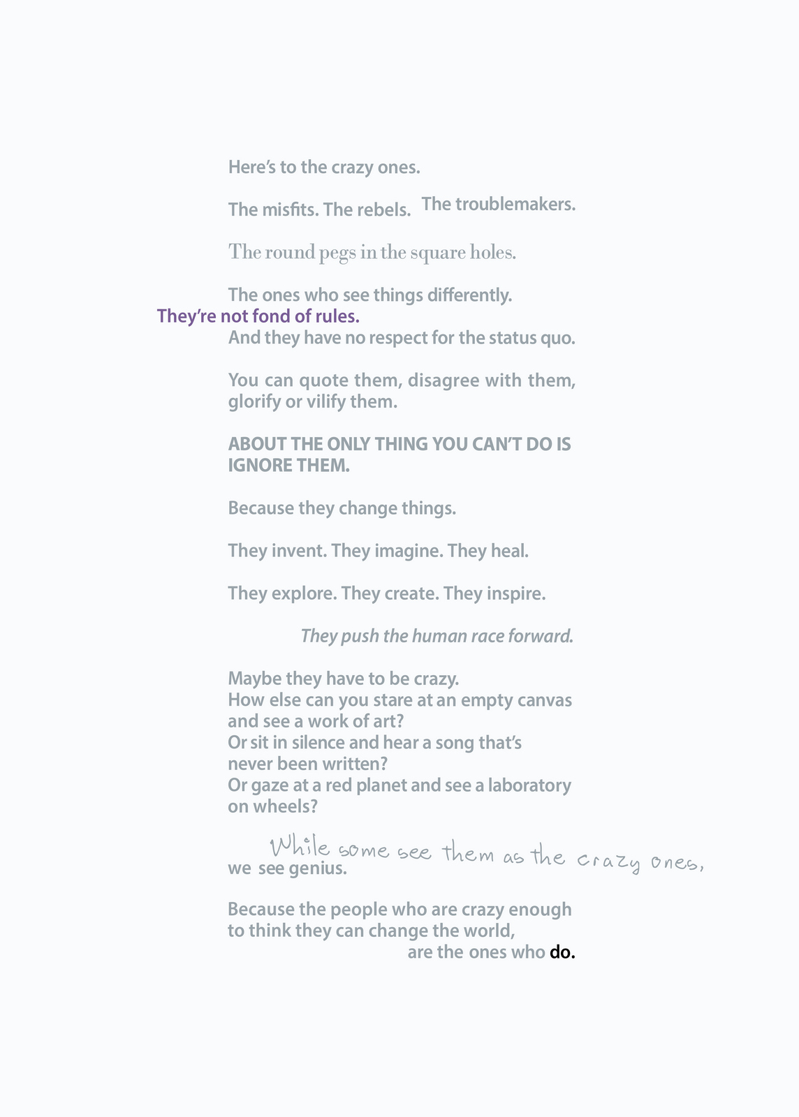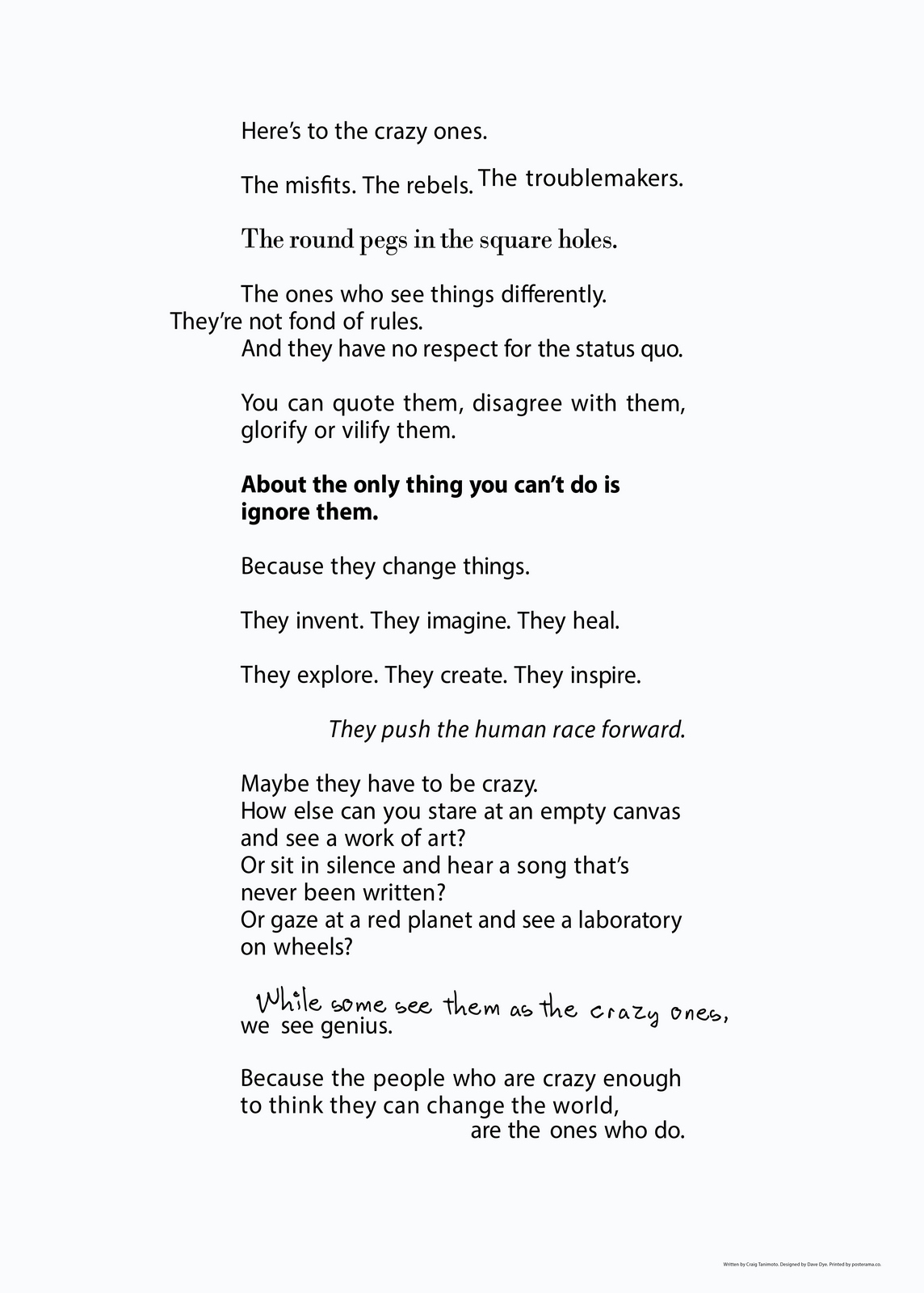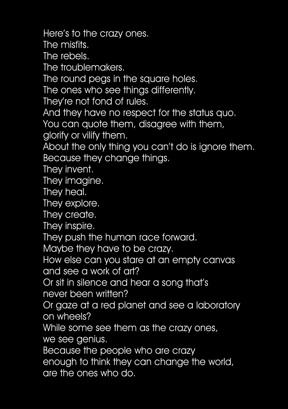 Pictures are great.As everyone knows, they’re worth a 1000 words, but they offer so much more; emotion, drama, humour, shock, surprise, information, style, etc, etc.So what do you do if you can't use one?If you’re an art director it’s especially tough, because your job is to make people engage against their will.So the temptation is to overcompensate with graphics.But it's a risk, as Bill Bernbach warned ‘Merely to let your imagination run riot, to dream unrelated dreams, to indulge in graphic and verbal gymnastics is NOT being creative.’The very process of pushing words around, changing fonts, colours and sizes can distract you from what you set out to do; deliver a message.It’s surprising how quickly people in our business move on from the message.Particularly on awards juries.Sit on an awards jury and the chances are you'll hear someone championing an cool looking campaign with language like ‘this is what our industry should be doing, leading not following culture, ripping up the rule book’.If you ask them what their favourite line or idea was, you often get responses like ‘Err…the blue one’, ‘The one where the words go up the side’ or ‘The one with the coloured squares’.Basically, they can't recall any of the messages in the ads.To be fair, awards juries are looking for fresh, new and unusual, so the feel becomes disproportionately more important than message.But, if you're in the business of communicating, it's worth checking in every so often to make sure you're communicating what you set out to communicate.When limited to graphics only, I often lapse into this process:STEP 1: Try to convey message simply and appropriately.STEP 2: Get distracted by trying to do something cool. STEP 3: Get back to trying to convey message simply and appropriately.It made me want to post a couple of examples.Part one is a bit weird.A few years ago, a guy from India got in touch saying he liked my work and would I create a poster for his company.He wanted me to use the text from Apple’s ‘Here’s to the Crazy Ones’.I love that ad.Whilst mulling over whether to do it or not, I ended up doing it.I couldn’t resist.THE VOMIT DRAFT.That's what screen writers call it, just put it down, don't over worry about it, get something down so that you have something to judge.Let's use Baskerville, that's a nice, readable font.