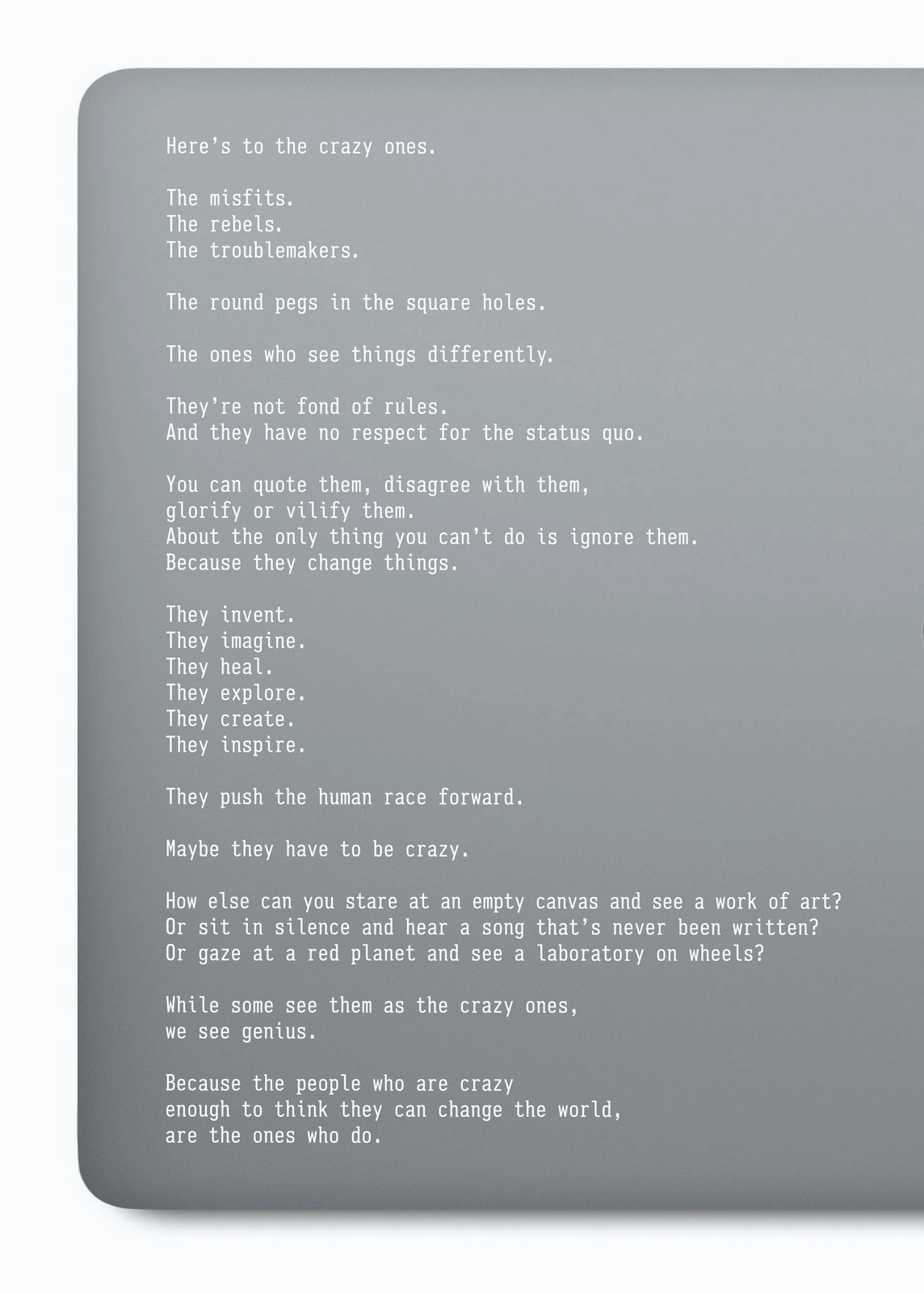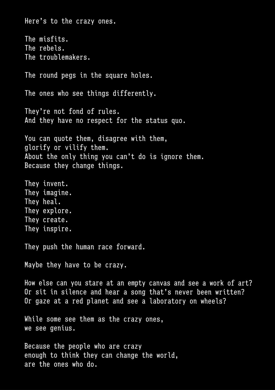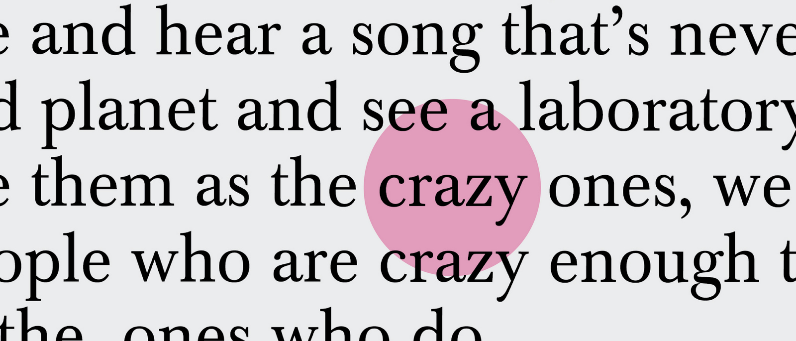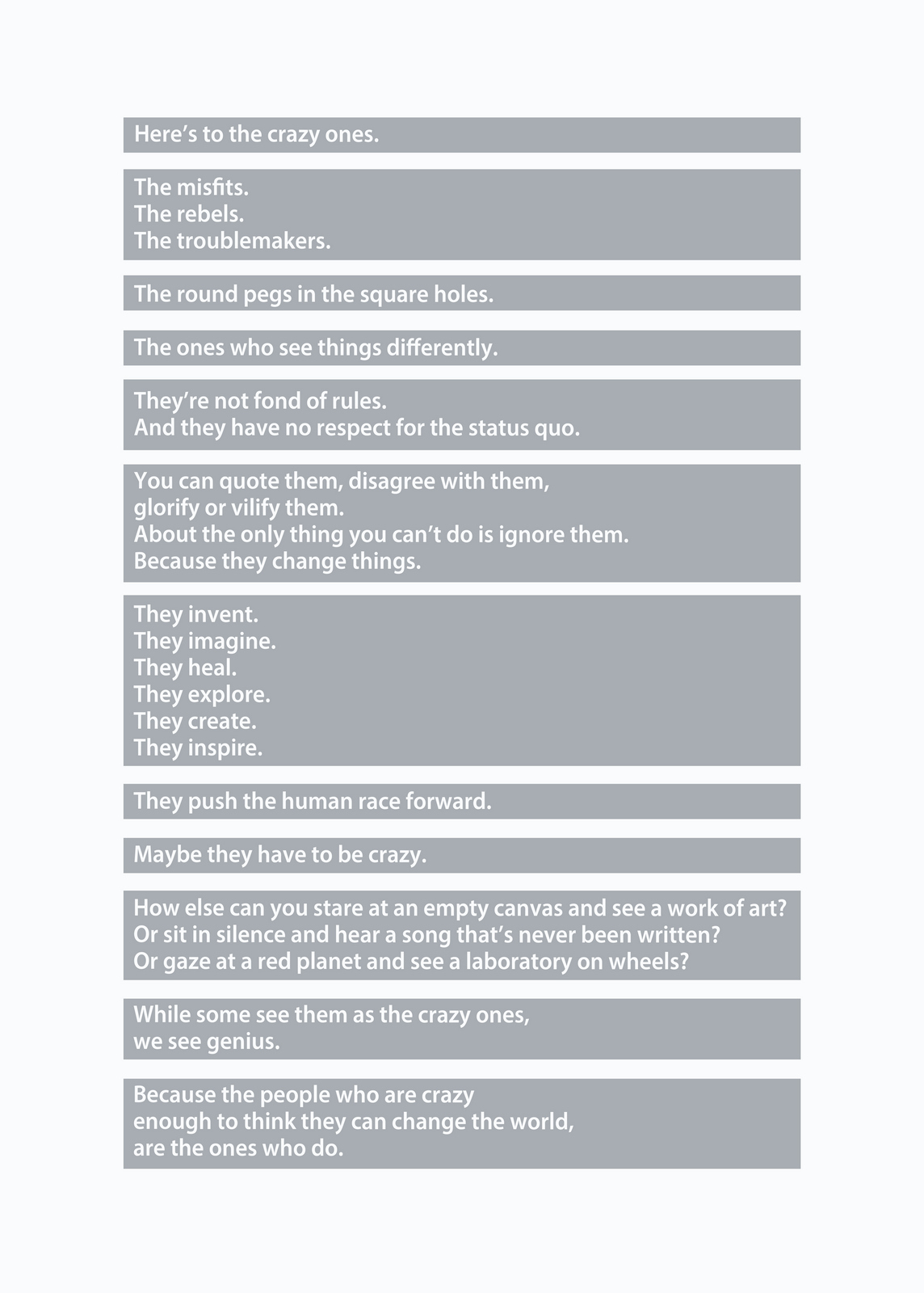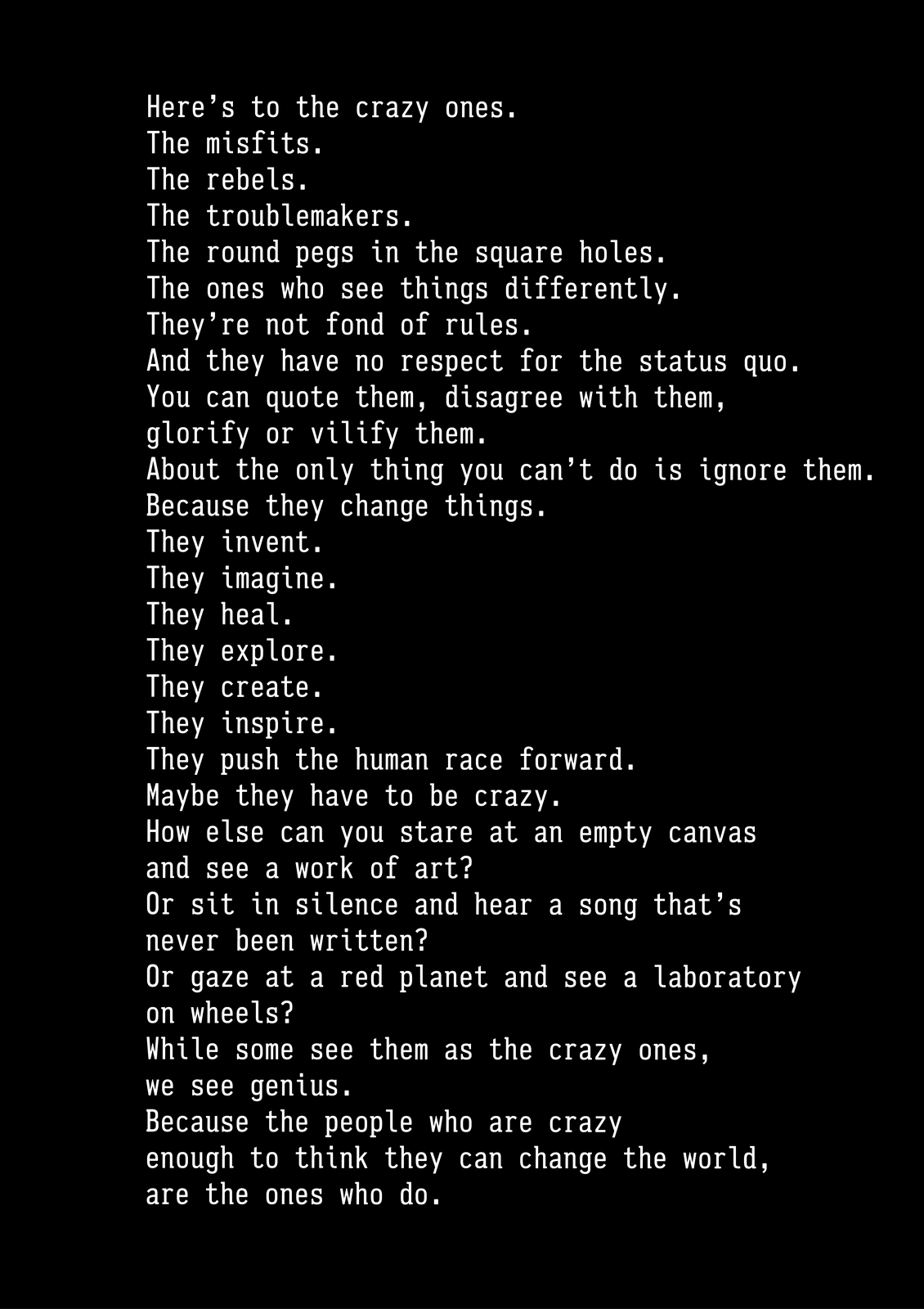 Pictures are great.As everyone knows, they’re worth a 1000 words, but they offer so much more; emotion, drama, humour, shock, surprise, information, style, etc, etc.So what do you do if you can't use one?If you’re an art director it’s especially tough, because your job is to make people engage against their will.So the temptation is to overcompensate with graphics.But it's a risk, as Bill Bernbach warned ‘Merely to let your imagination run riot, to dream unrelated dreams, to indulge in graphic and verbal gymnastics is NOT being creative.’The very process of pushing words around, changing fonts, colours and sizes can distract you from what you set out to do; deliver a message.It’s surprising how quickly people in our business move on from the message.Particularly on awards juries.Sit on an awards jury and the chances are you'll hear someone championing an cool looking campaign with language like ‘this is what our industry should be doing, leading not following culture, ripping up the rule book’.If you ask them what their favourite line or idea was, you often get responses like ‘Err…the blue one’, ‘The one where the words go up the side’ or ‘The one with the coloured squares’.Basically, they can't recall any of the messages in the ads.To be fair, awards juries are looking for fresh, new and unusual, so the feel becomes disproportionately more important than message.But, if you're in the business of communicating, it's worth checking in every so often to make sure you're communicating what you set out to communicate.When limited to graphics only, I often lapse into this process:STEP 1: Try to convey message simply and appropriately.STEP 2: Get distracted by trying to do something cool. STEP 3: Get back to trying to convey message simply and appropriately.It made me want to post a couple of examples.Part one is a bit weird.A few years ago, a guy from India got in touch saying he liked my work and would I create a poster for his company.He wanted me to use the text from Apple’s ‘Here’s to the Crazy Ones’.I love that ad.Whilst mulling over whether to do it or not, I ended up doing it.I couldn’t resist.THE VOMIT DRAFT.That's what screen writers call it, just put it down, don't over worry about it, get something down so that you have something to judge.Let's use Baskerville, that's a nice, readable font.