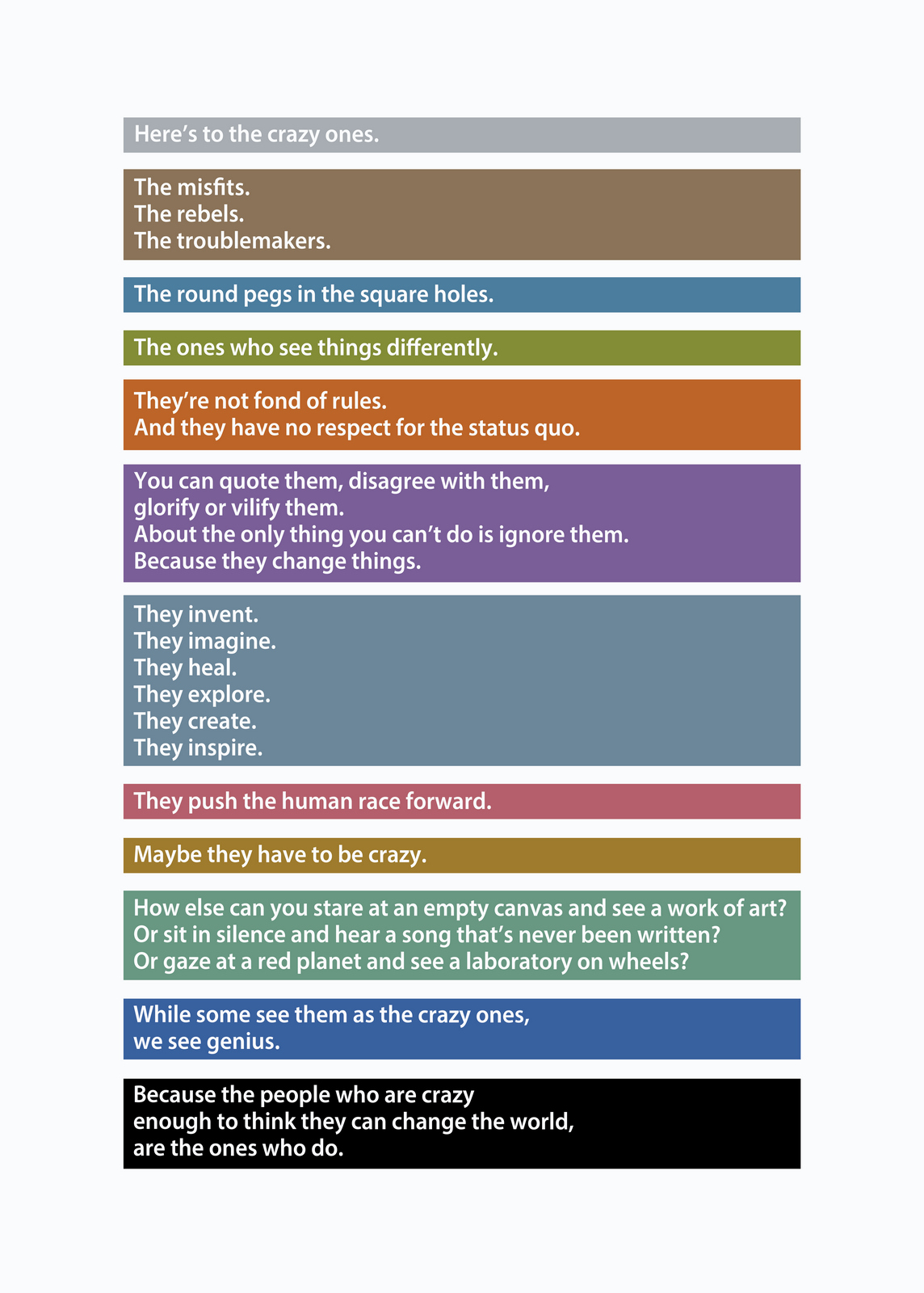 Maybe each line should have it's own colour?We could group sections in a similar tone when they run on.And maybe we try to emphasise the ideas within each line with some typograhical device?